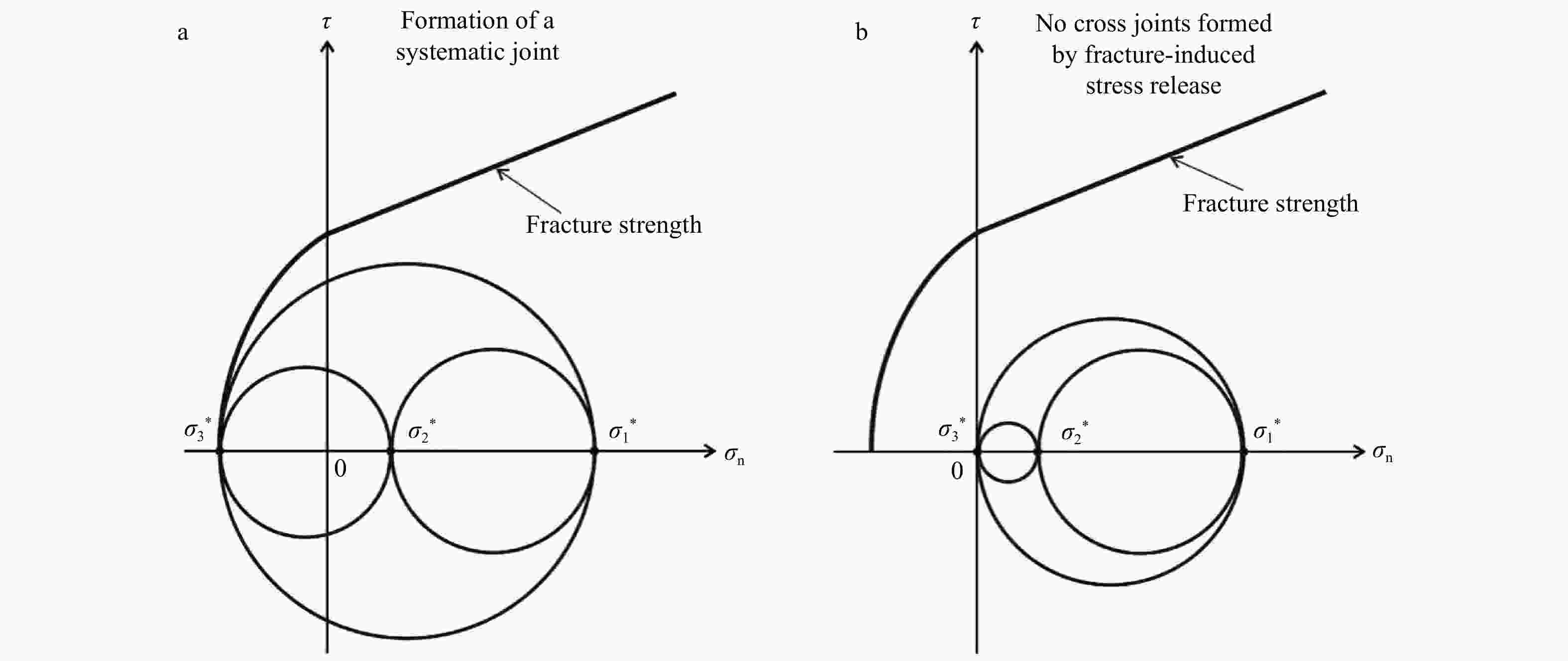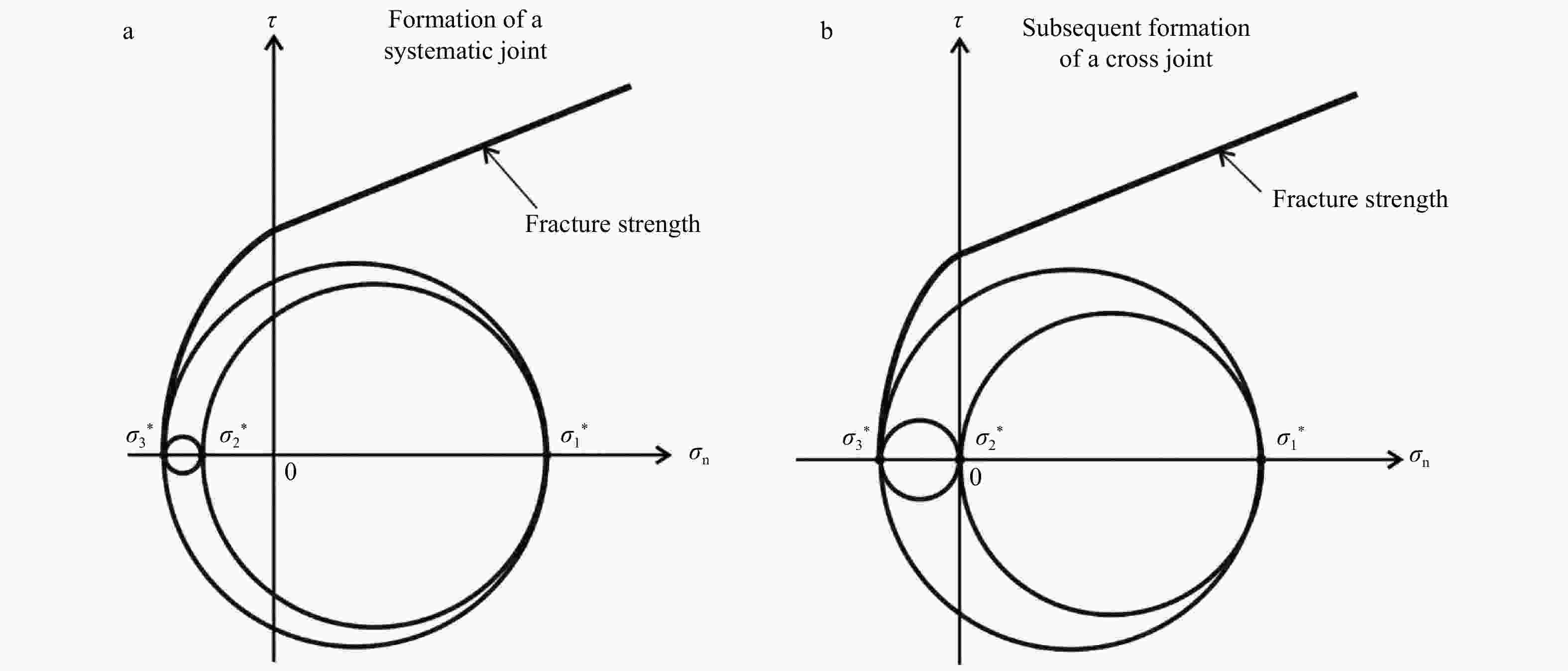 a—主节理形成瞬间的应力状态 σ1* > σ2* > 0 > σ3*;b—主节理形成后的应力状态:σ1* > σ2* > σ3* = 0,从而阻止横节理的发育