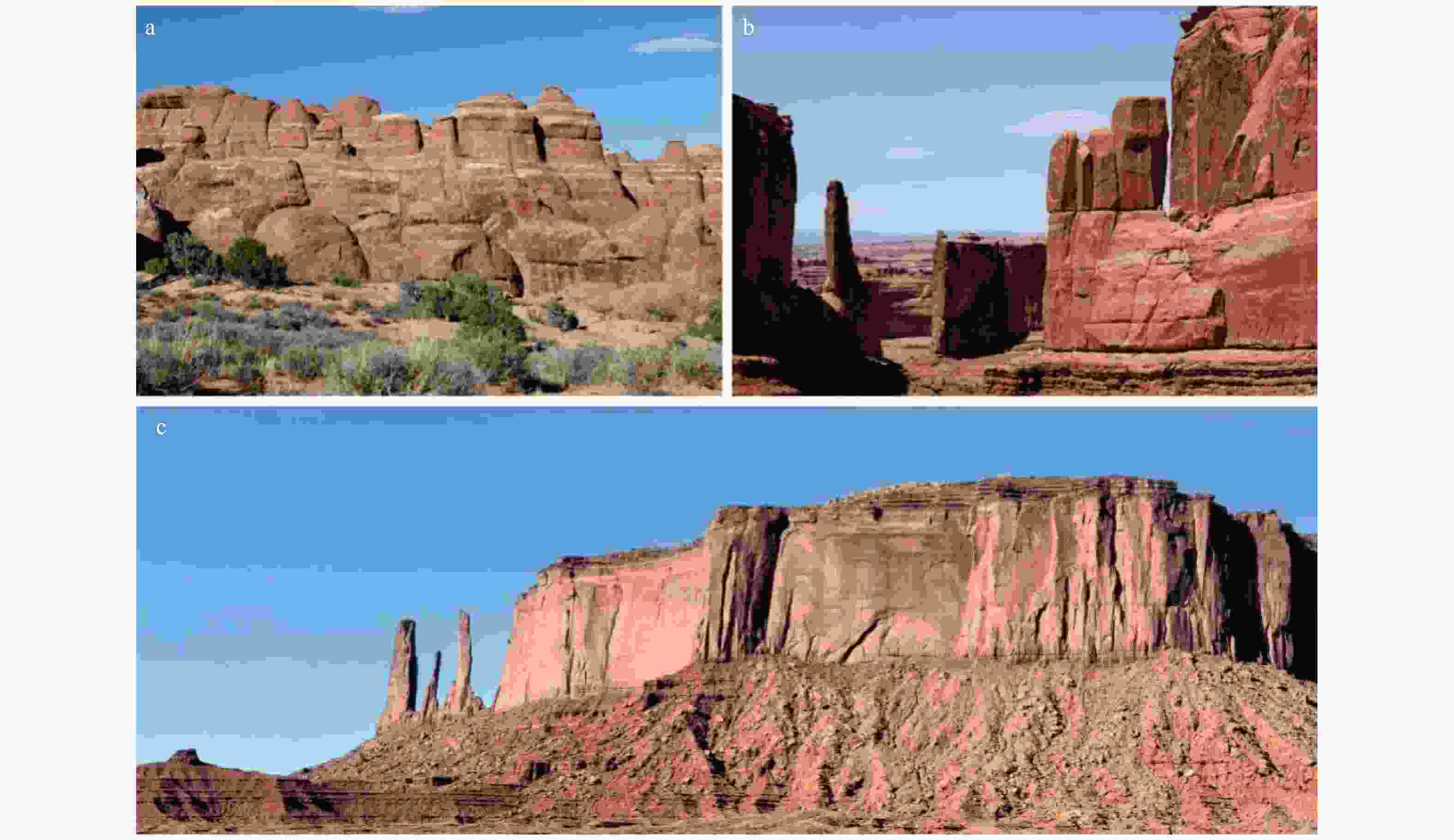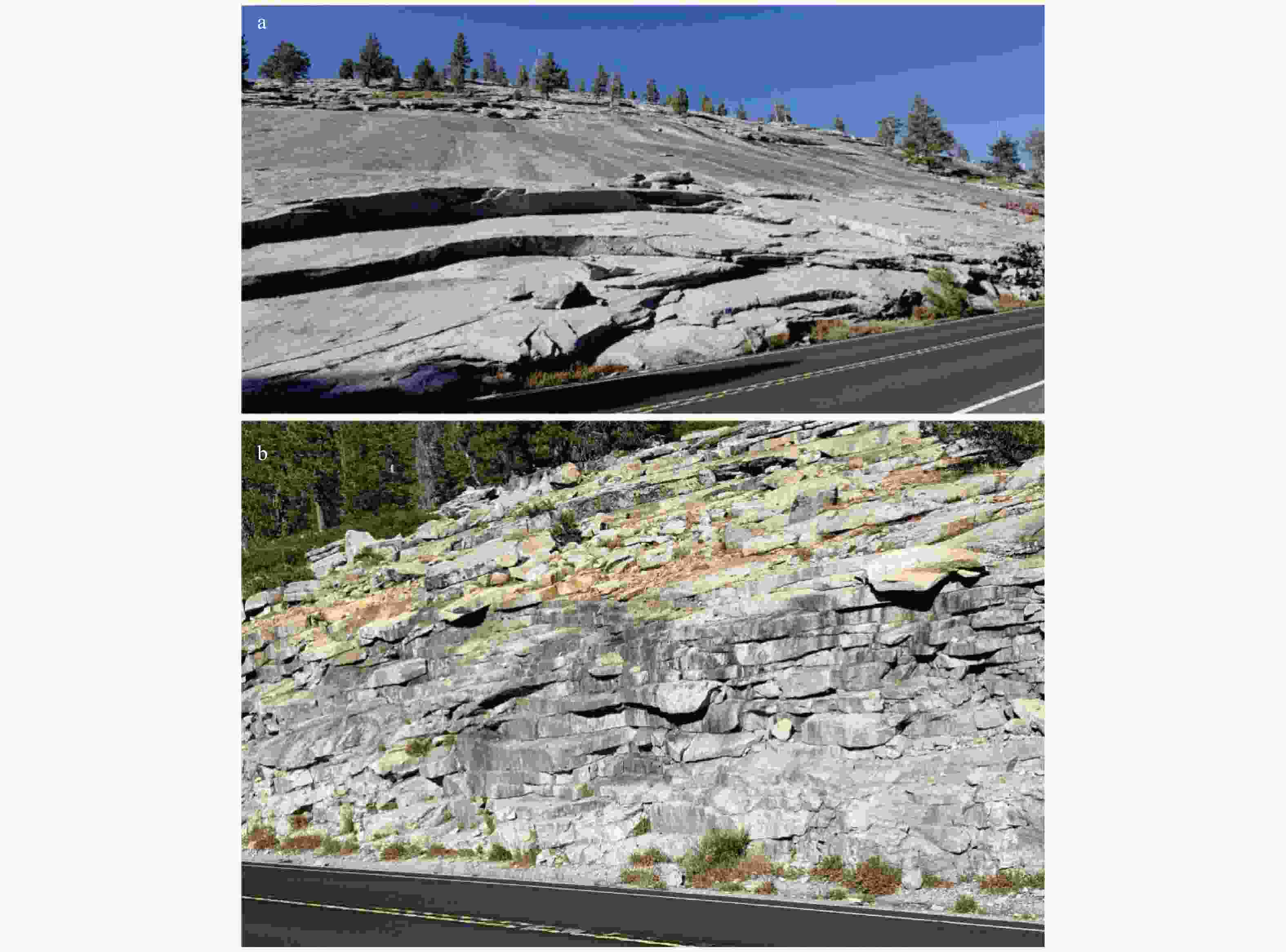 a—小比例尺的宏观观察;b—大比例尺的详细观察,花岗岩因剥蚀作用呈现出逐层剥离的特征
