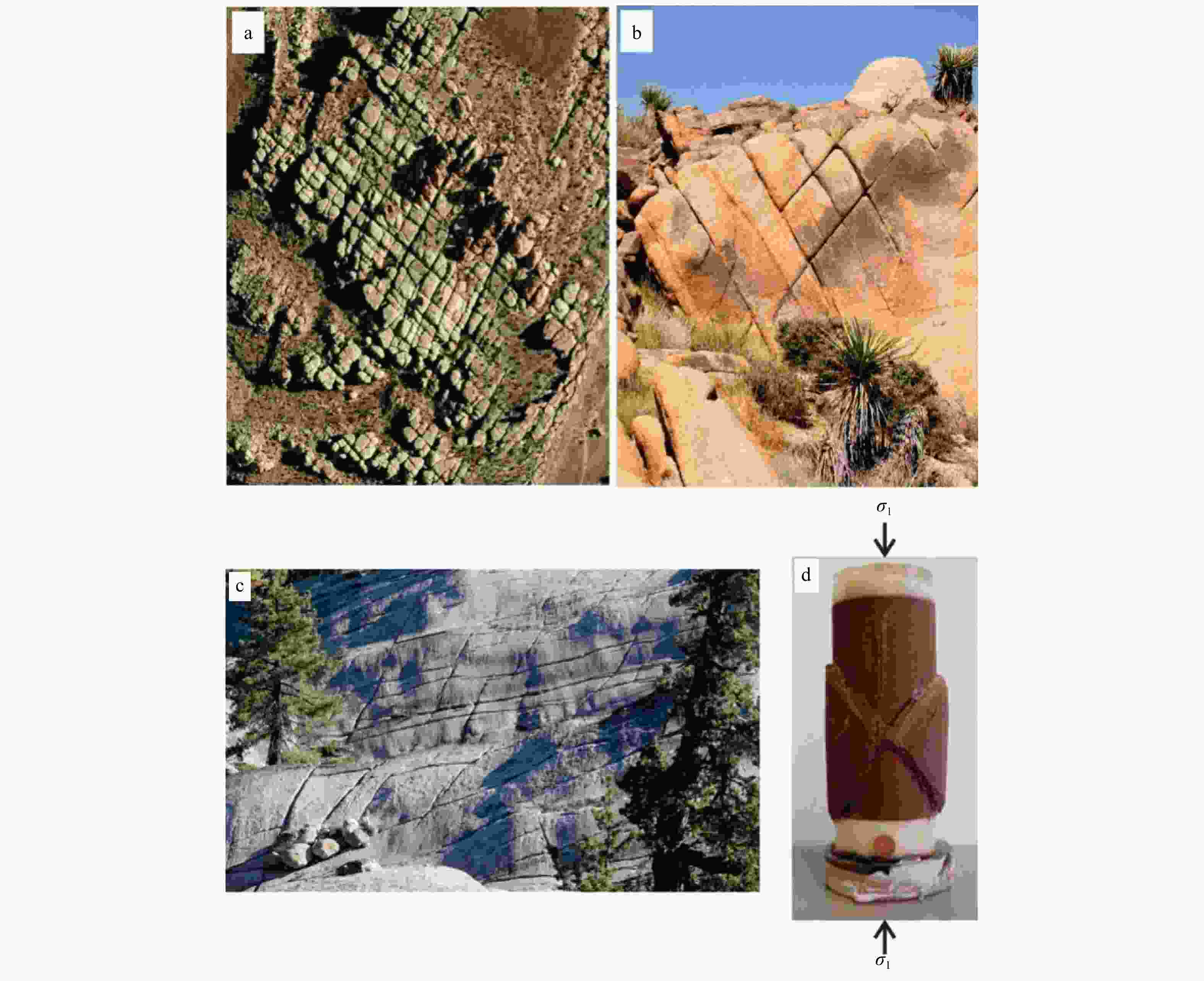 a—美国犹他州峡谷地国家公园砂岩中的共轭剪切节理 (Fossen, 2016);b—美国加利福尼亚州约书亚树国家公园 Split Rock 区砂岩中的共轭剪节理;c—加利福尼亚州优胜美地国家公园花岗岩中的共轭剪节理;d—实验变形岩石样品中形成的共轭剪节理