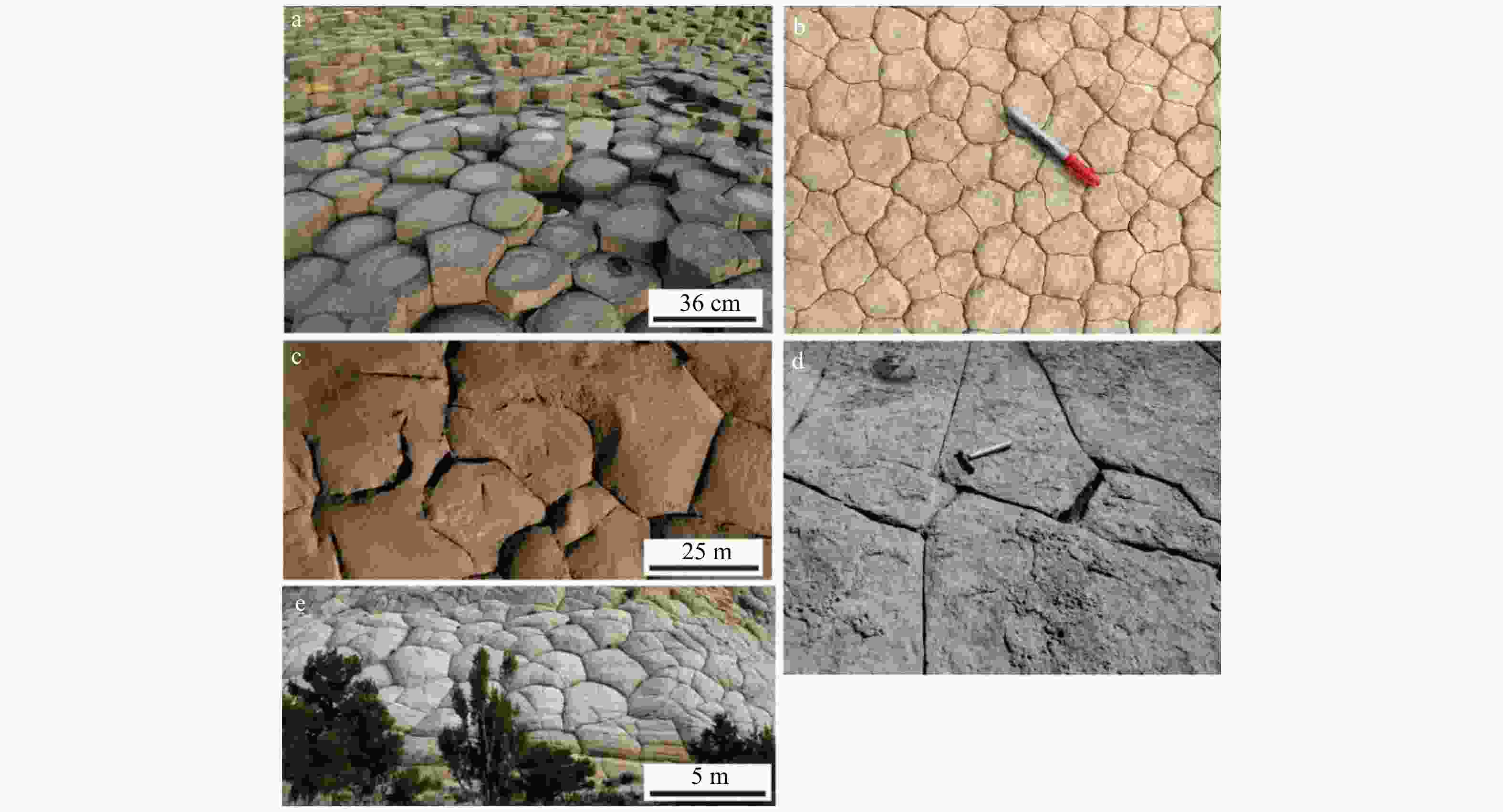 a—北爱尔兰巨人堤玄武岩中的柱状节理;b—干旱形成的泥裂;c—火星Gordii Dorsum地区Medusae Fossae 永久冻土中的柱状节理(NASA);d—加拿大魁北克 Havre-Saint-Pierre 石灰岩中的柱状节理;e—美国亚利桑那州 Vermilion Cliffs 国家纪念区 White Pocket 砂岩中的柱状节理