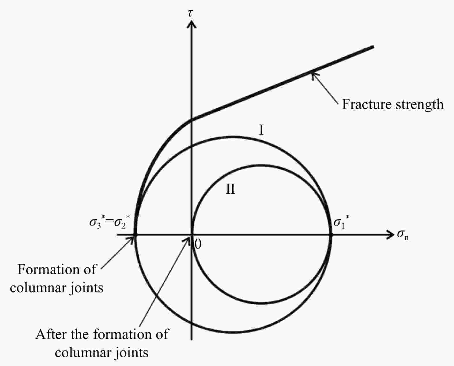 图 6 摩尔圆,表示柱状节理的形成条件(圆 I),以及形成后应力释放(圆 II)。多边形节理网络的发育需要出现双轴应力状态(σ1* > 0 > σ2* = σ3*)