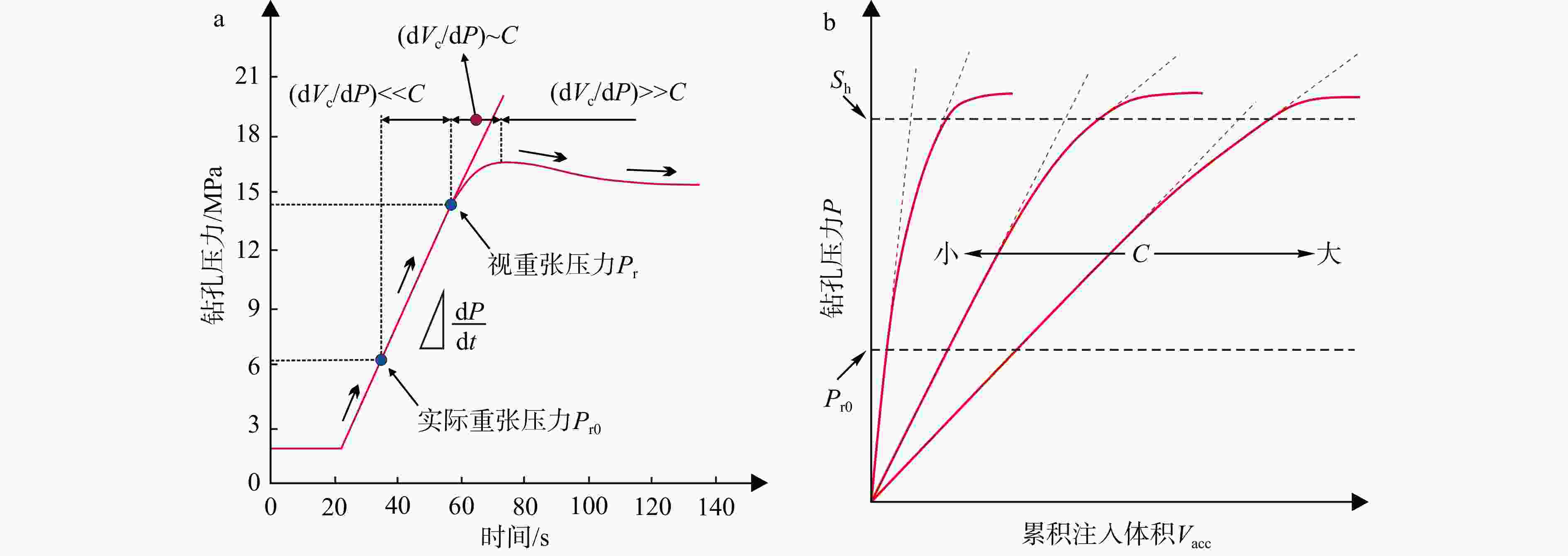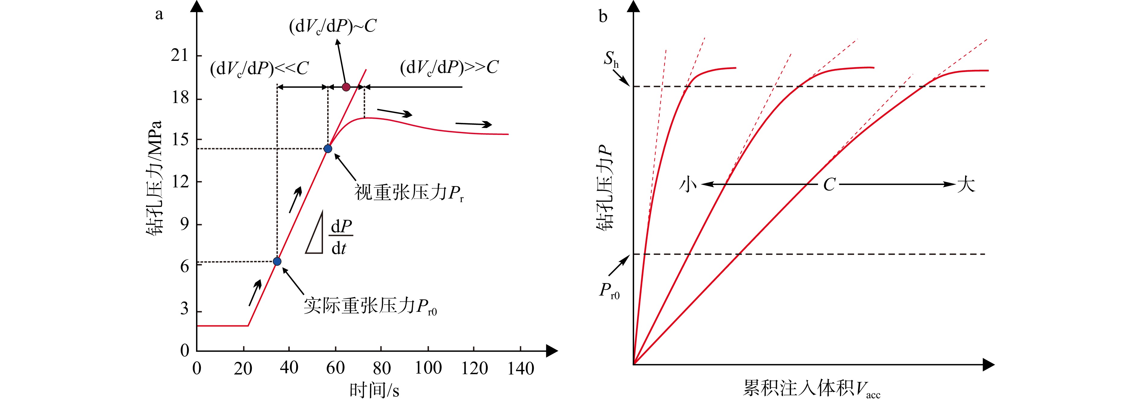 C—系统柔度;Vc—裂缝张开引起的水体体积变化;dVc/dP—单位压力下裂缝张开对应的体积变化;Sh—最小水平主应力(a)重张过程中的系统柔度随时间变化;(b)系统柔度与重张压力关系曲线