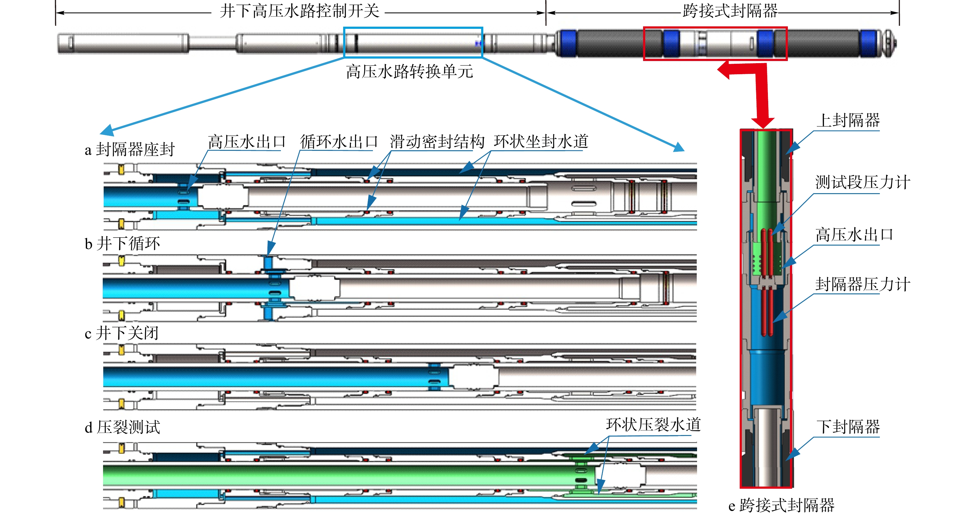 a—封隔器坐封水路;b—井下循环水路;c—井下关闭水路;d—压裂测试水路;e—跨接式封隔器