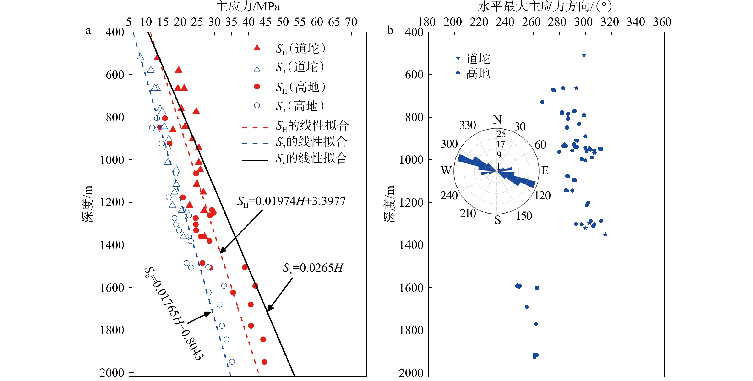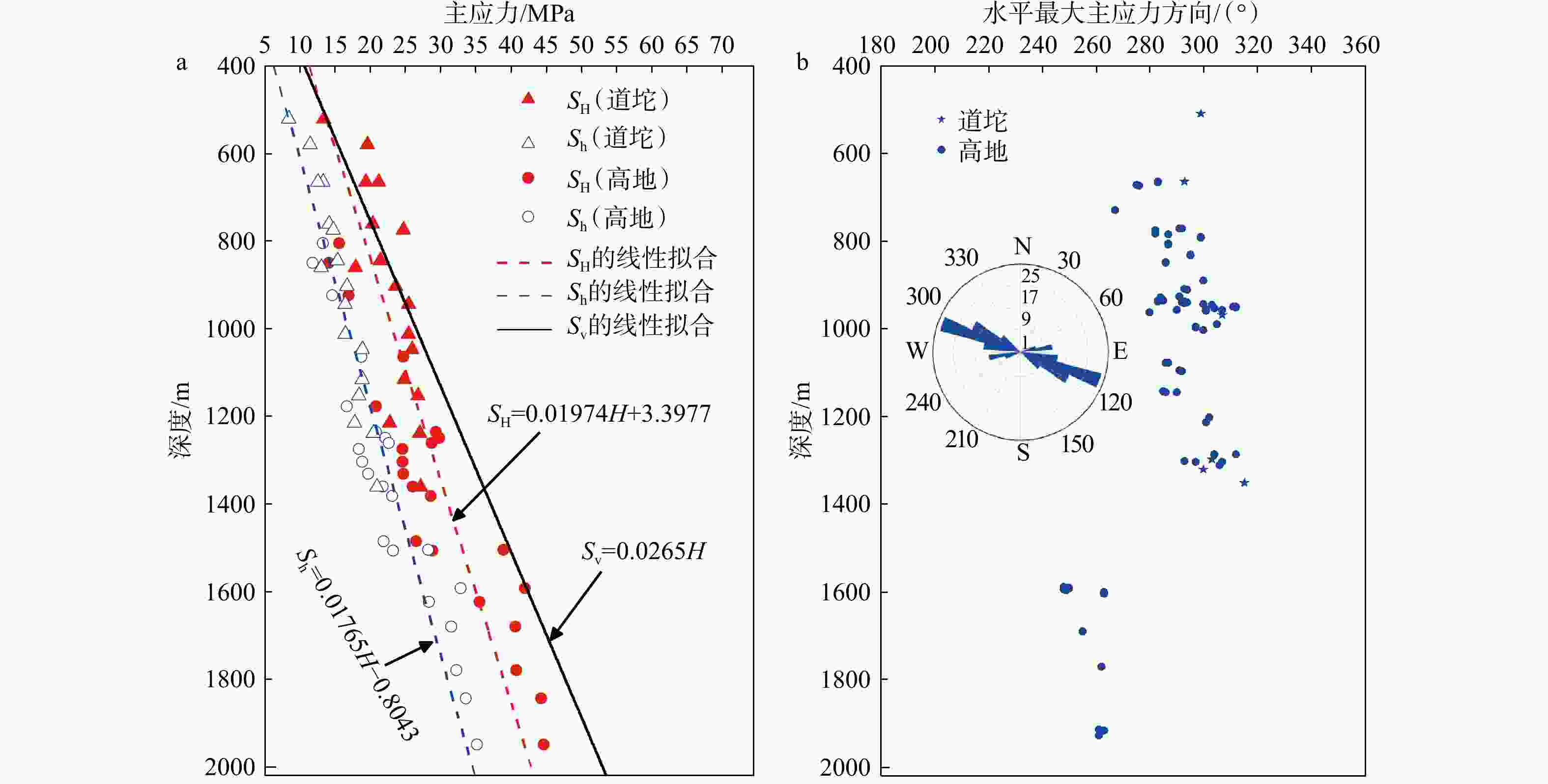 a—主应力量值随深度变化;b—最大水平主应力方向随深度变化