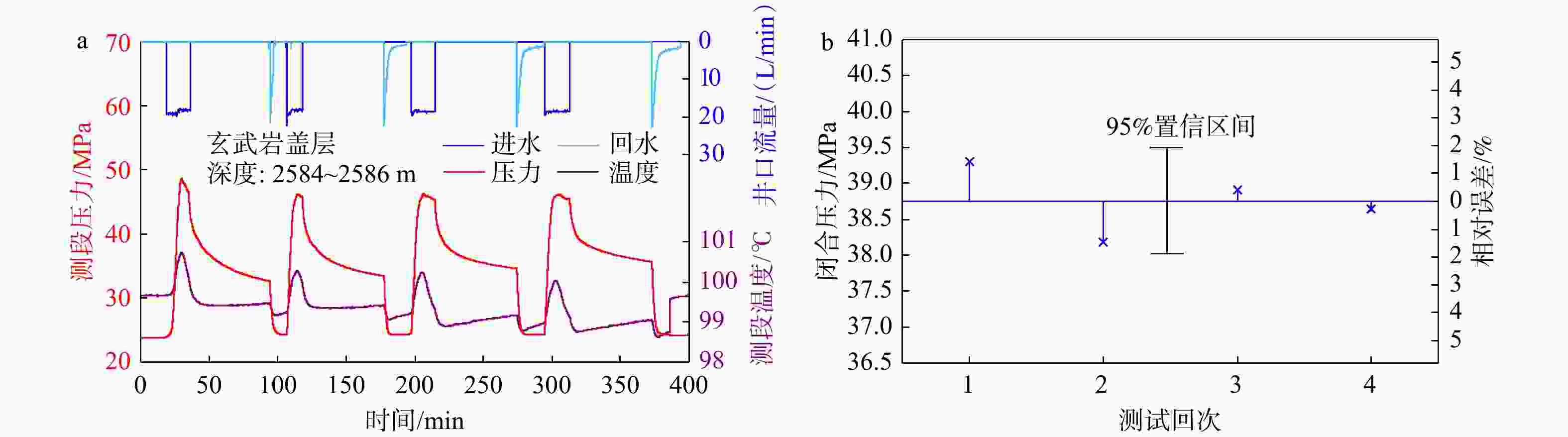 a—压力−流量−温度与时间曲线;b—4个回次闭合压力的相对误差