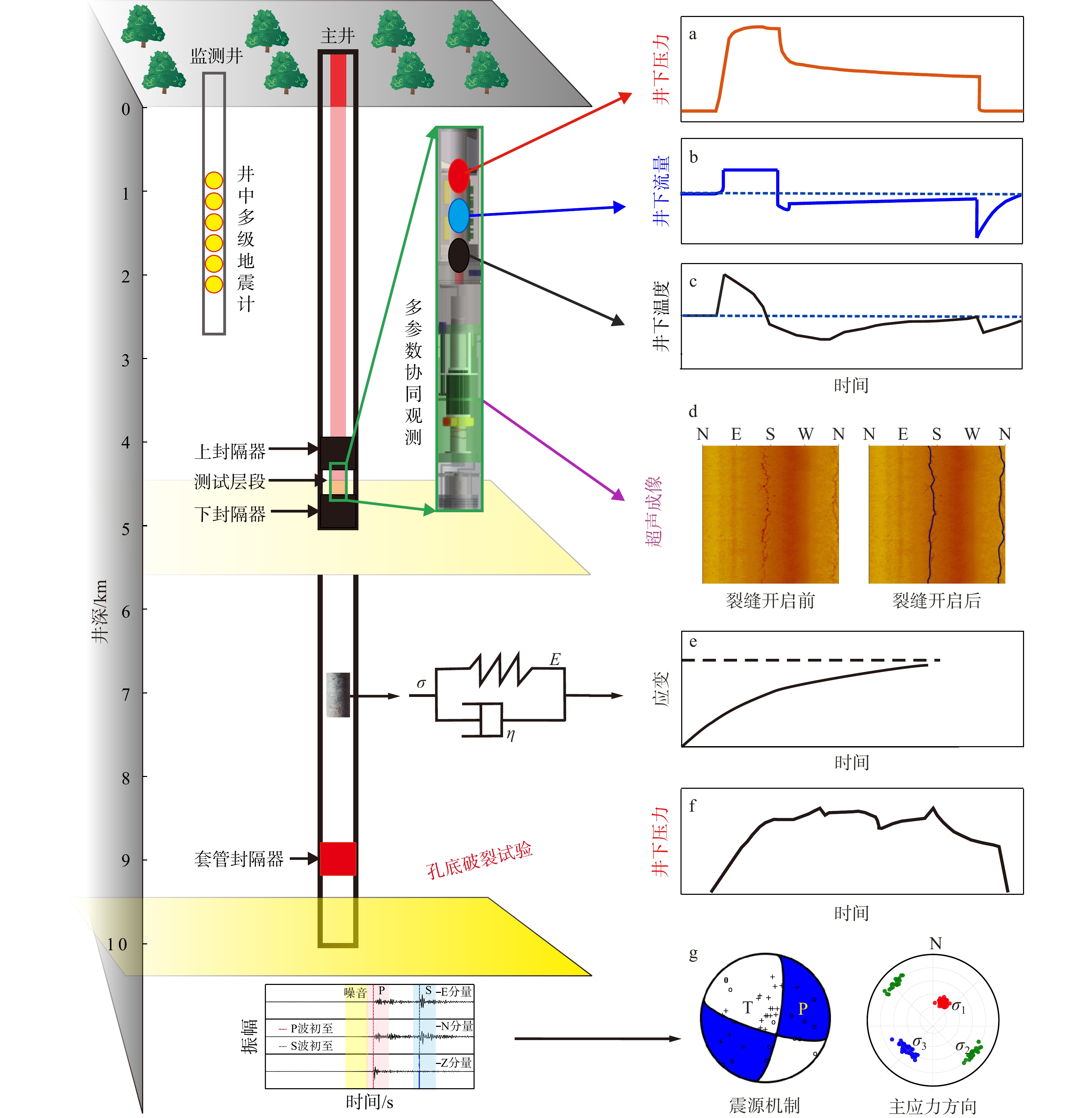 a—井下压力时间曲线;b—井下流量时间曲线;c—井下温度时间曲线;d—压力缝井壁图像;e—岩芯滞弹性应变恢复曲线;f—井底破裂试验曲线;g—基于地震波的应力场反演