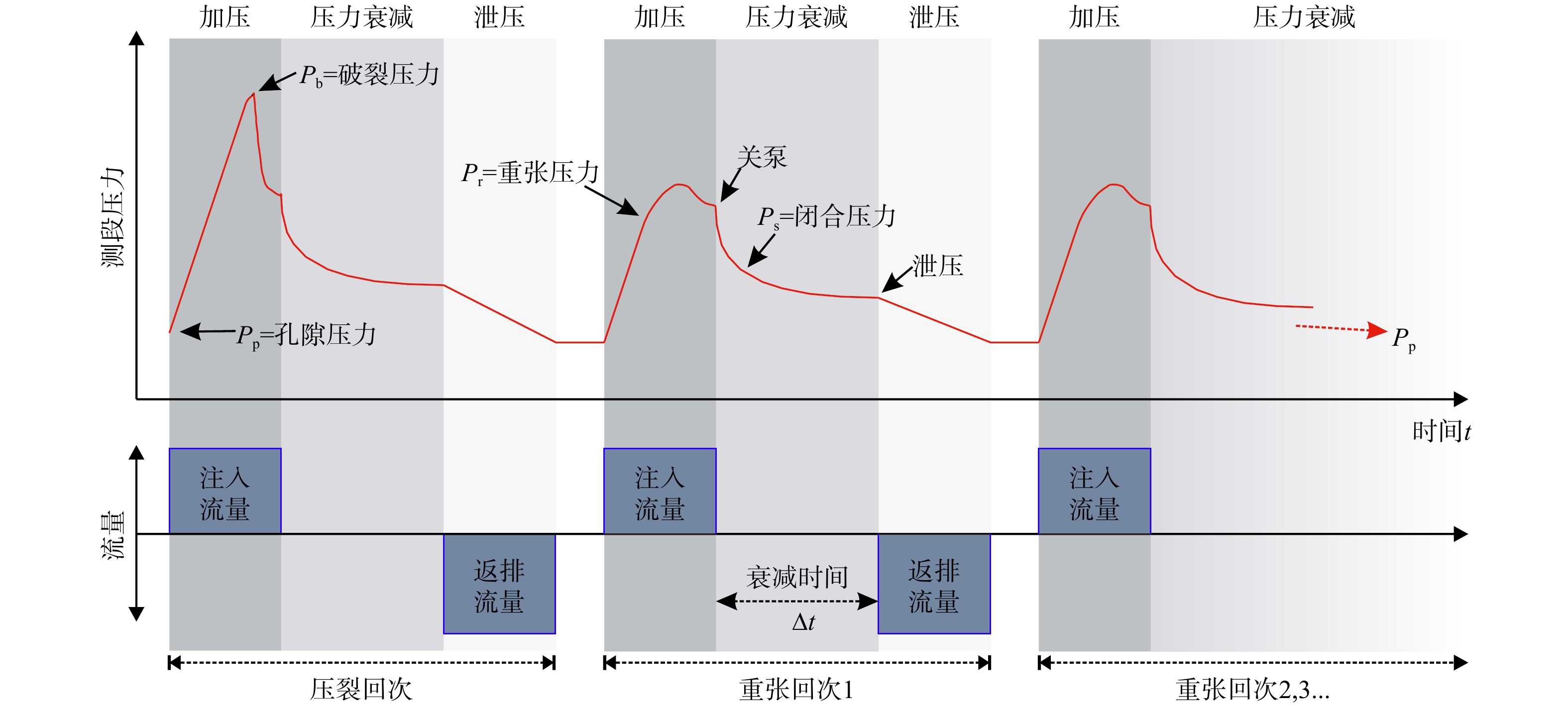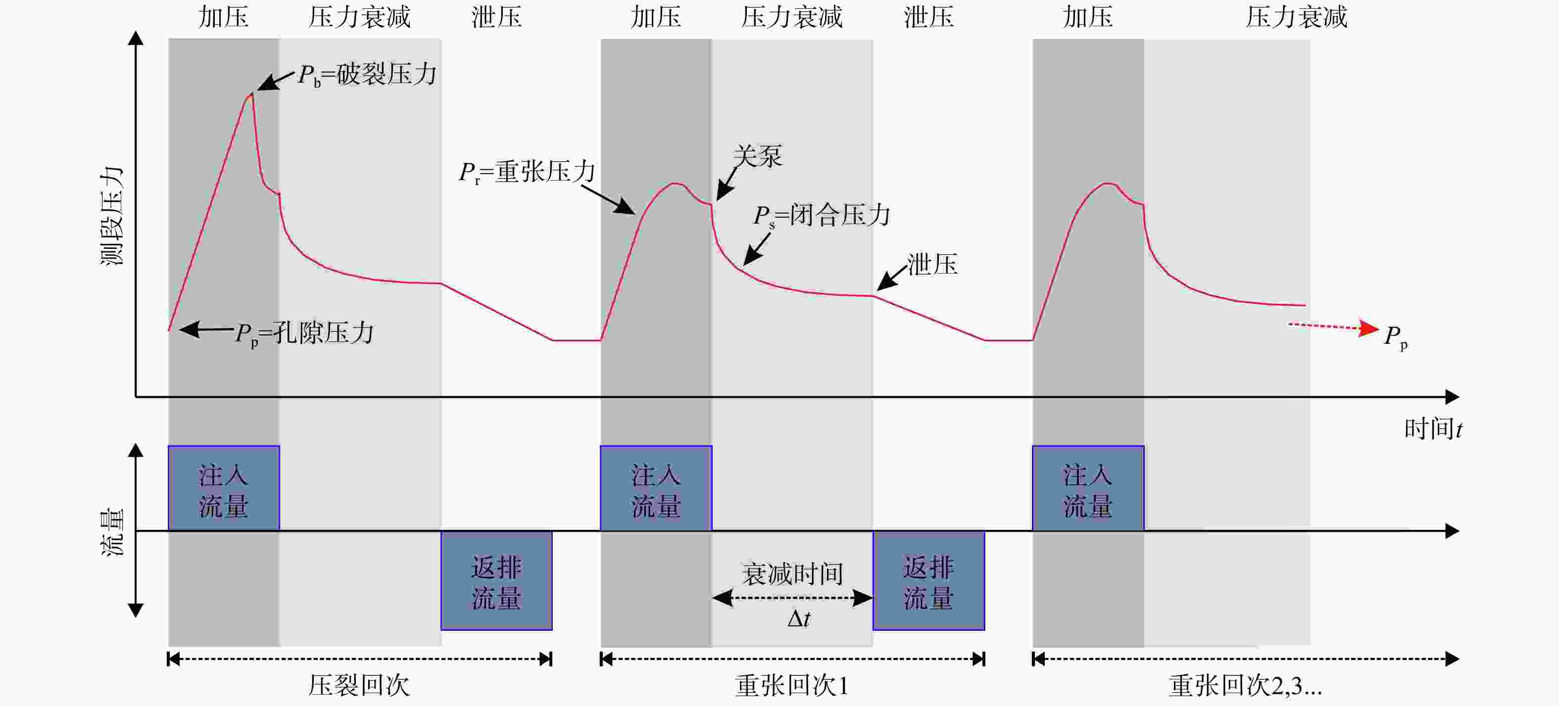 Figure 4. Pressure and flowrate curves of hydraulic fracturing in situ stress measurements