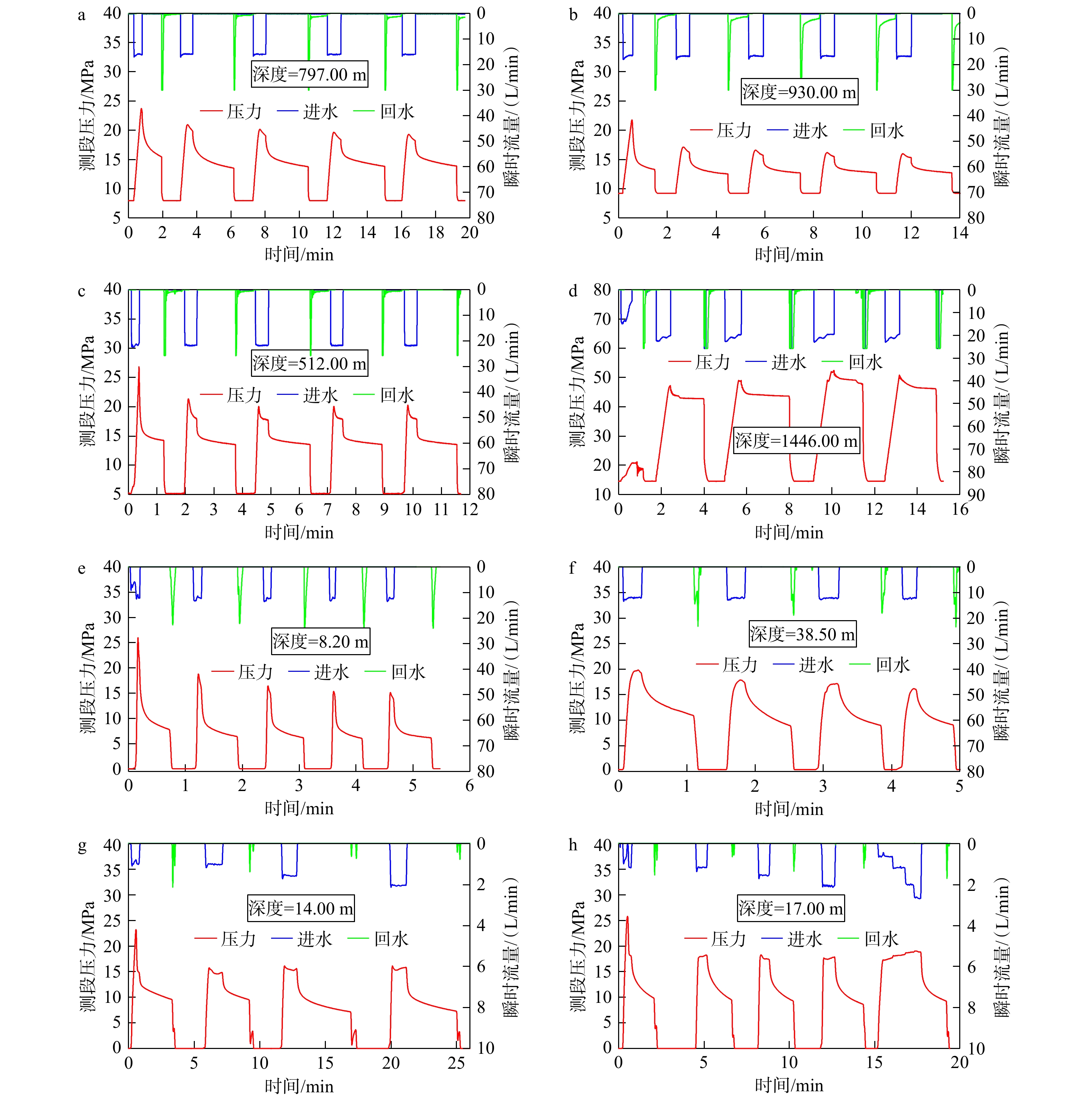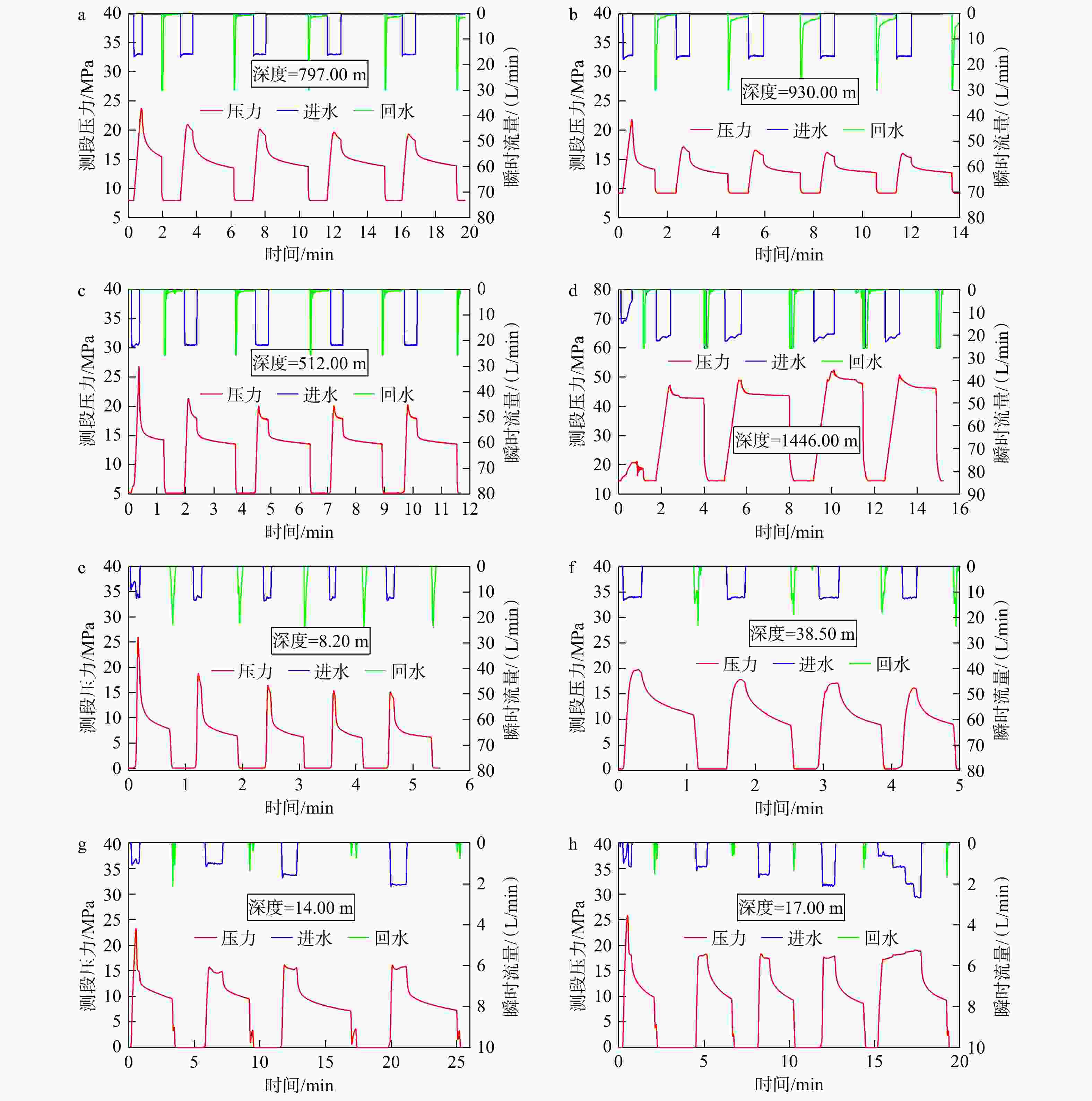 图 4 各测段水压致裂地应力测量压力和流量曲线