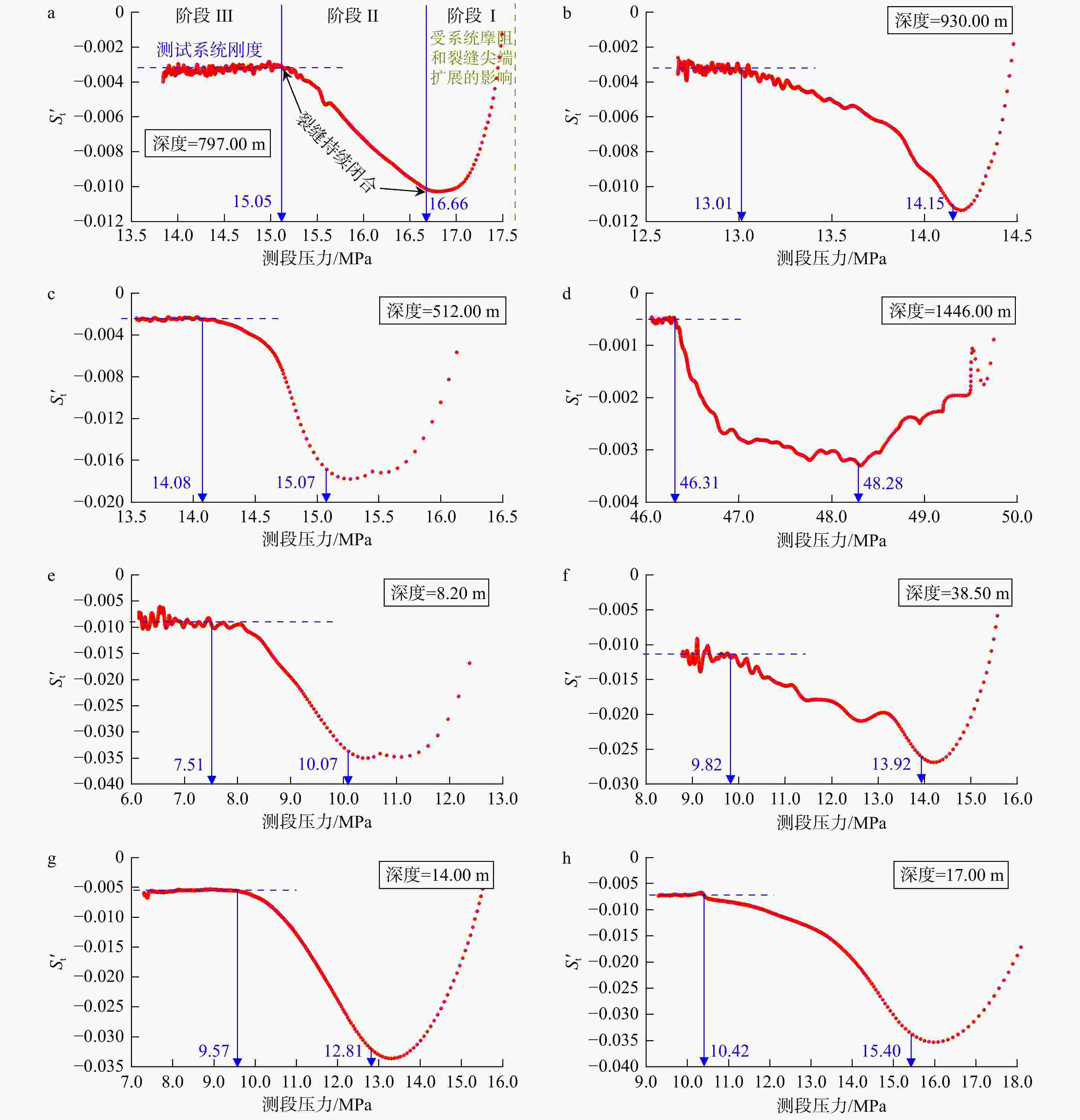 (a) Granite, depth 797.00 m; (b) Granite, depth 930.00 m; (c) Limestone, depth 512.00 m; (d) Siliceous rock, depth 1446.00 m; (e) Gneiss, depth 8.20 m; (f) Gneiss, depth 38.50 m; (g) Granite, depth 14.00 m (horizontal borehole); (h) Granite, depth 17.00 m (horizontal borehole)The blue arrows indicate the inflection points for identifying fracture-closure behavior.