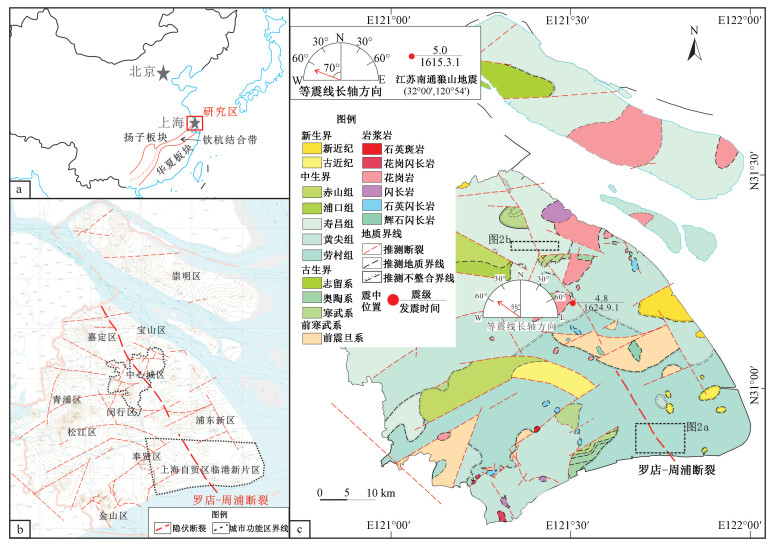 a—研究区大地构造背景图(据杨明桂等,2015修改);b—上海市隐伏断裂分布示意图; c—上海市基岩地质及探测区域位置示意图(地震信息来自上海市地震局,1992)