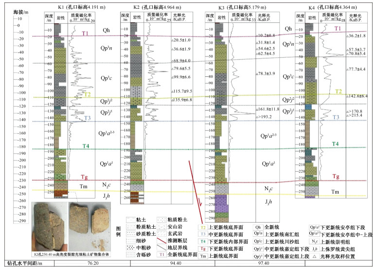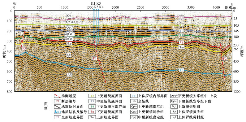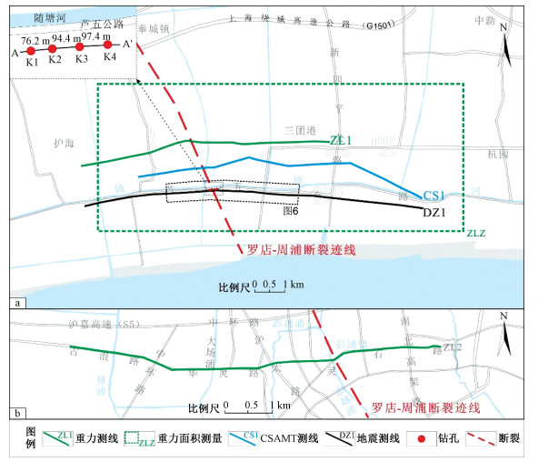 摘要: 罗店-周浦断裂是纵贯上海市中心城区重要的北西向隐伏活动断裂,其第四纪活动性对城市地质安全至关重要。通过高精度重力勘探、浅层地震勘探及可控源大地音频电磁测深勘探等地球物理方法,结合钻探联井剖面及光释光年代学测定,对罗店-周浦断裂在区域内的展布特征及第四纪活动性进行了探测与研究。结果表明,该断裂在上海市南部区域仍具有较好的延展性,断裂行迹在重力剖面、可控源音频大地电磁测深剖面及浅层人工地震剖面上都有较好的反映。重力面积测量结果显示该断裂在上海市南部呈现为一组近平行断层行迹;浅层人工地震勘探与钻孔地层联合剖面揭露断层最浅上断点埋深相似(约为200 m),可控源大地音频电磁测深反映断裂深部特征明显。物探剖面及钻孔联合剖面综合显示,断裂并未明显错断上覆中更新统上部地层,结合光释光年代学标定,认为该断裂最新活动时代为早更新世。罗店-周浦断裂与区内历史地震事件关系密切,目前区域地应力环境为北西向压应力状态,该断裂易于发生张扭性活动,其活动性特征及地震危险性特征需要持续关注。Abstract: The Luodian-Zhoupu fault is an important NW-trending buried active fault that runs through the downtown area of Shanghai City. Its Quaternary activity significantly affects the urban geological safety. We applied a set of integrated geophysical methods to carry out high-precision gravity, shallow seismic and controlled source audio magneto telluric (CSAMT) explorations in the study area, and studied the distribution pattern and activity level of the Luodian-Zhoupu fault, combining with joint borehole profile and optically stimulated luminescence chronology. The exploration results reveal good ductility of the fault in southern Shanghai, and the fault trace is well reflected in the profiles of gravity, CSAMT and shallow artificial seismicity. Gravity area measurements show that the fault appears as a group of nearly parallel fault tracks in southern Shanghai. The buried depths of the shallowest breakpoints researched by the shallow seismic exploration and joint borehole profile method are in good agreement (~200 m). TCSAMT profile displays obvious deep fault features. The research outcomes from the profiles with geophysical exploration and joint borehole indicate no obvious trace of the fault breaking into the overlying Middle Pleistocene, and it is believed that the latest active age of the fault is the Early Pleistocene referring to the result of optically stimulated luminescence dating. Since the Luodian-Zhoupu fault is closely related to regional historical seismic events, and the regional stress state is currently NW-compressive, with the fault prone to tensile and torsional activities, its activity and seismic risk characteristics require continuous attention.