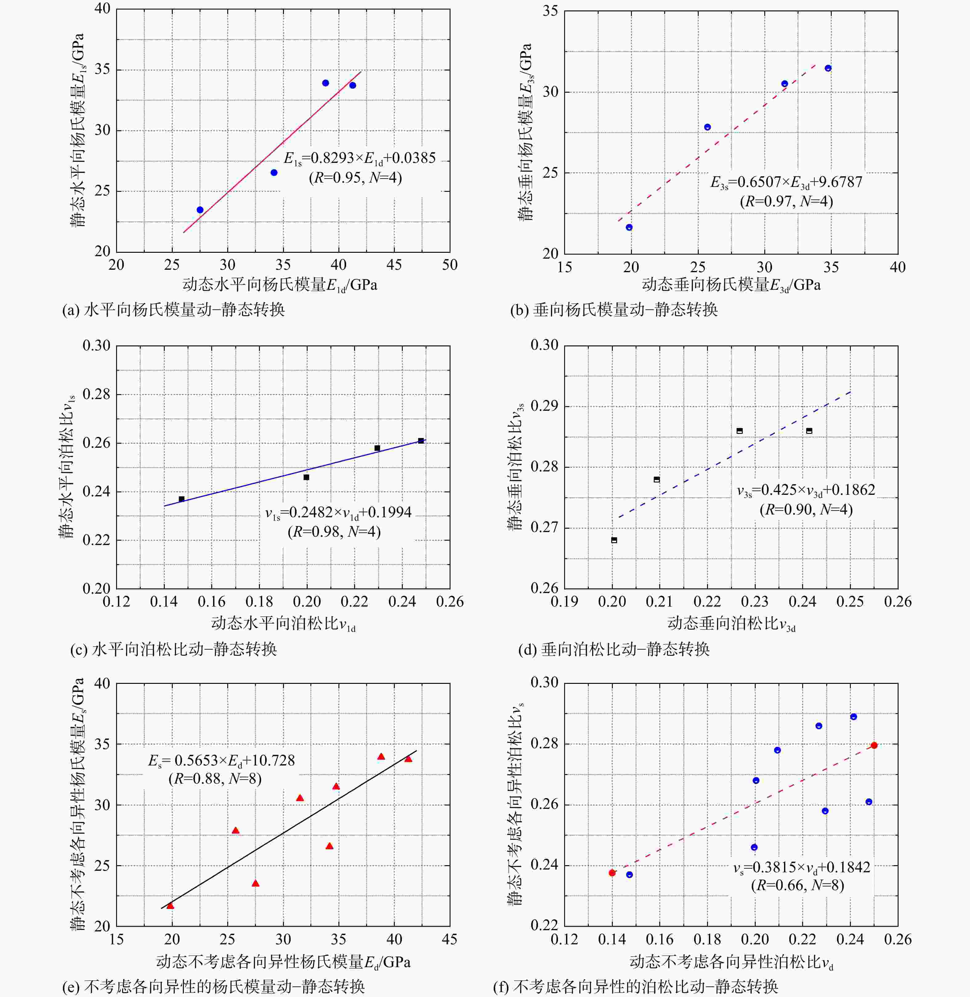 (a) Dynamic and static conversion of the horizontal Young's modulus; (b) Dynamic and static conversion of the vertical Young's modulus; (c) Dynamic and static conversion of the horizontal Poisson's ratio; (d) Dynamic and static conversion of the vertical Poisson's ratio; (e) Dynamic and static conversion of Young's modulus without considering anisotropy; (f) Dynamic and static conversion of Poisson's ratio without considering anisotropy E1s—Static horizontal Young's modulus; E1d—Dynamic horizontal Young's modulus; E3s—Static vertical Young's modulus; E3d—Dynamic vertical Young's modulus; Es—Static Young's modulus without considering anisotropy; Ed—Dynamic Young's modulus without considering anisotropy; ν1s—Static horizontal Poisson's ratio; ν1d—Dynamic horizontal Poisson's ratio; ν3s—Static vertical Poisson's ratio; ν3d—Dynamic vertical Poisson's ratio; νs—Static Poisson's ratio without considering anisotropy; νd—Dynamic Poisson's ratio without considering anisotropy; N—Number of core tests; R—Correlation coefficient