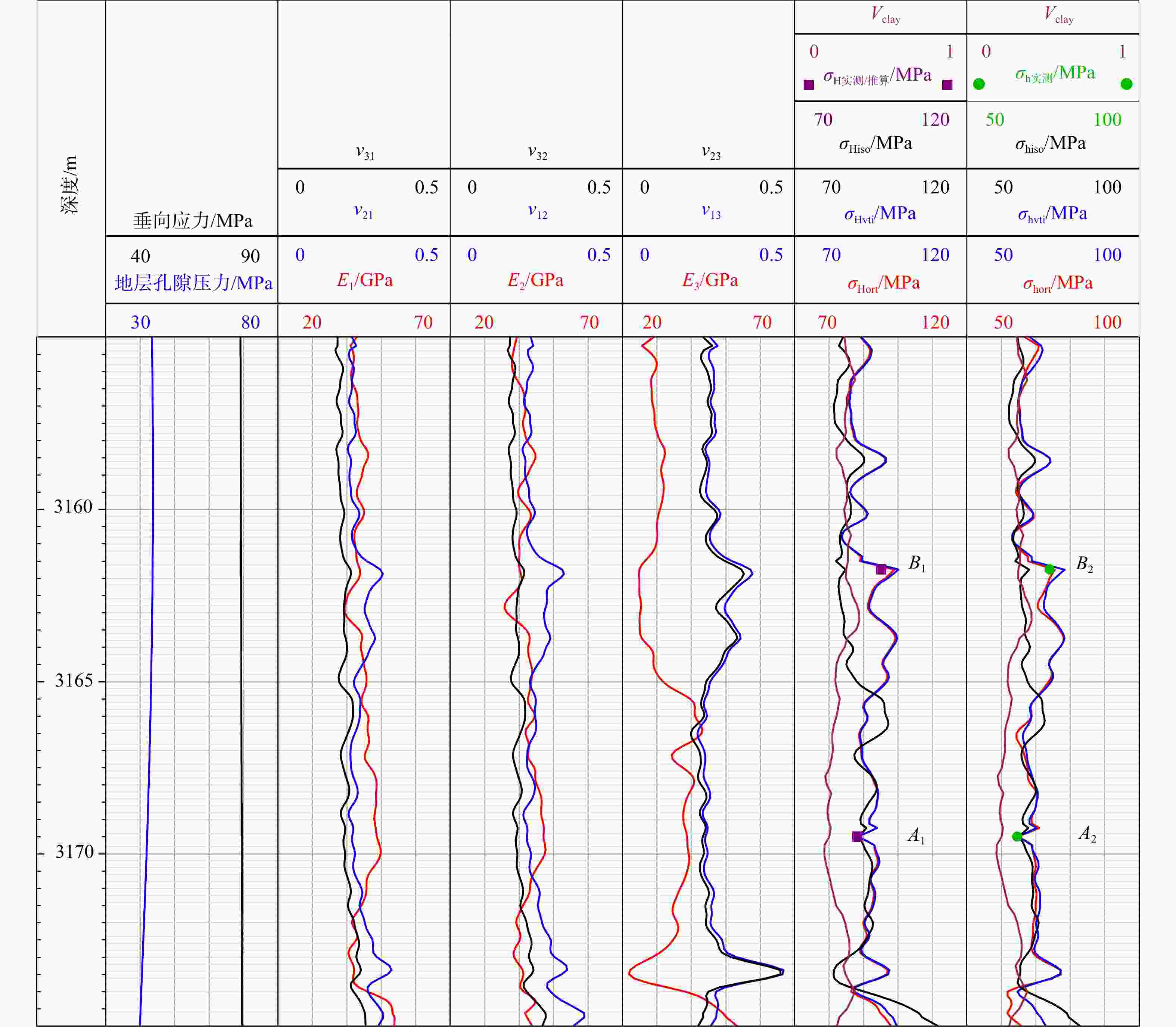 Vclay—黏土含量;σH实测/推算—微注测试推算或声发射实测最大水平主应力;σHiso—iso模型预测最大水平主应力;σHvti—VTI模型预测最大水平主应力;σHort—ORT模型预测最大水平主应力;σh实测—微注测试或声发射实测最小水平主应力;σhiso—iso模型预测最小水平主应力;σhvti—VTI模型预测最小水平主应力;σhort—ORT模型预测最小水平主应力;A1—微注测试反算最大水平主应力点位;A2—微注测试最小水平主应力点位;B1—声发射测试最大水平主应力点位;B2—声发射测试最小水平主应力点位