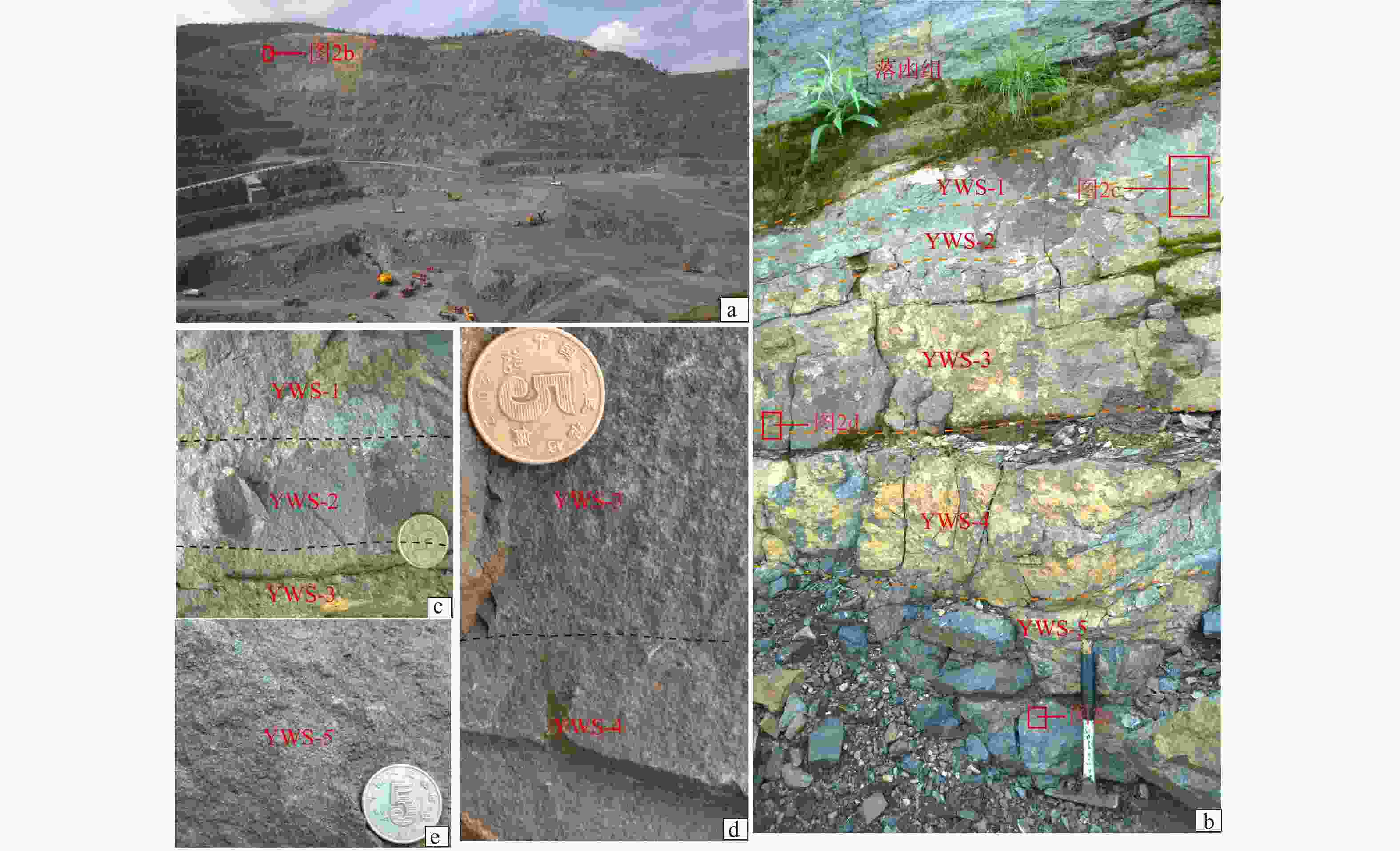 a—含矿镁铁质层状岩席在拉拉Fe-Cu矿床大露天采场的产出位置;b—岩体的地质产状和岩相分带特征;c—YWS-1相带—YWS-3相带的手标本特征及其接触关系;d—YWS-3相带和YWS-4相带的手标本特征及其接触关系;e—YWS-5相带的手标本特征