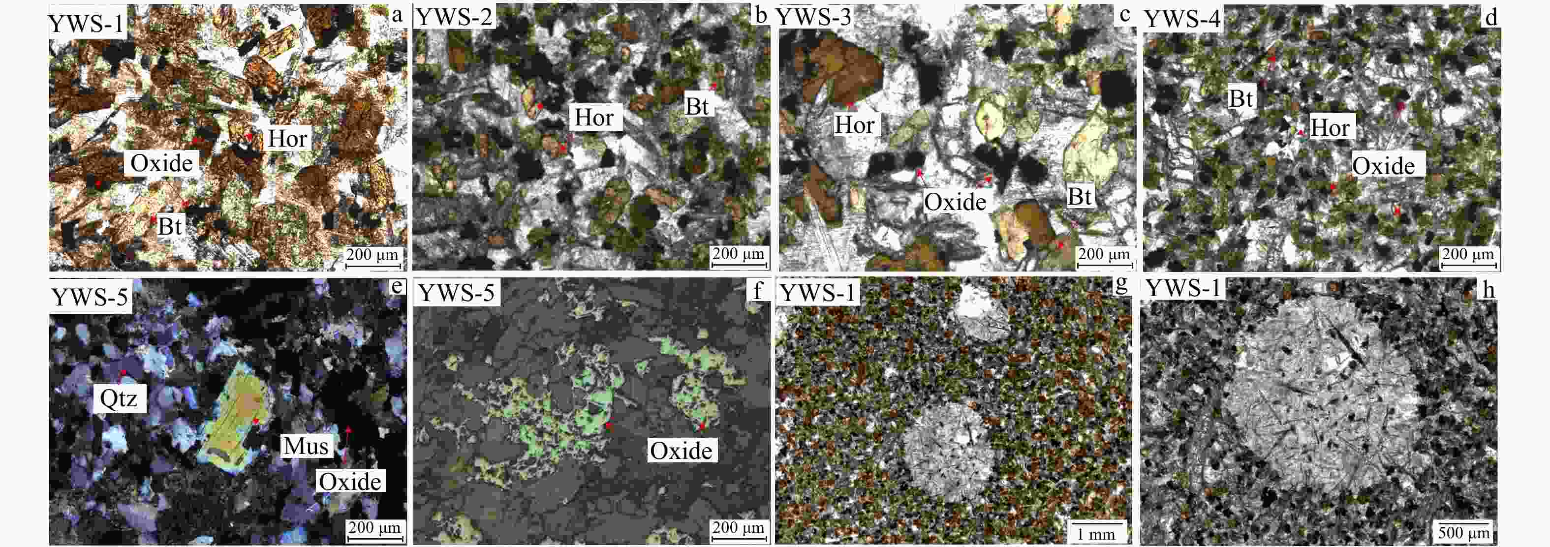 Hor—角闪石;Bt—黑云母;Mus—白云母;Oxide—Fe-Ti氧化物;Qtz—石英a—YWS-1相带单偏光下见角闪石、黑云母及氧化物矿物等;b—YWS-2相带单偏光下见角闪石、黑云母及氧化物矿物等;c—YWS-3相带单偏光下见角闪石、黑云母及氧化物矿物等;d—YWS-4相带单偏光下见角闪石、黑云母及氧化物矿物等;e—YWS-5相带正交偏光下见石英、白云母及氧化物矿物等;f—YWS-5相带反光镜下见氧化物矿物;g—YWS-1相带单偏光下见气孔构造;h—YWS-1相带正交偏光下见气孔构造