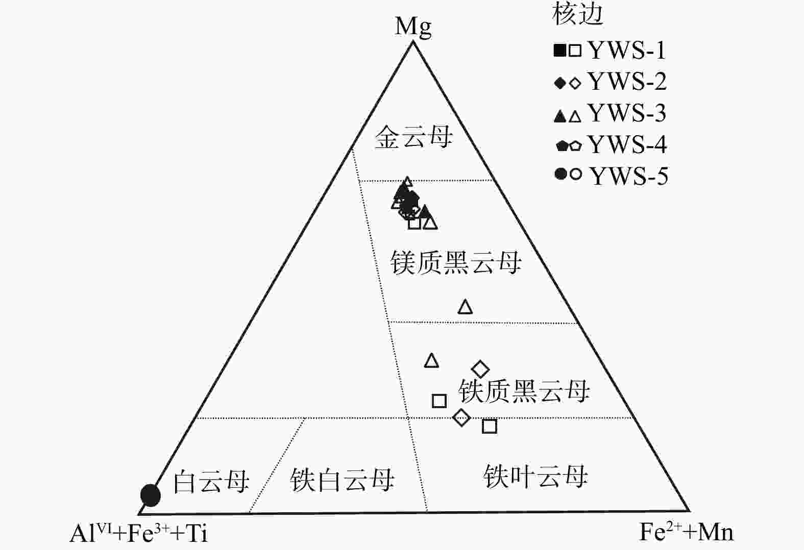 Figure  5.  Compositional distribution of mica in Zone YWS-1 to Zone YWS-5 (modified from the mica Mg–(AlVI+Fe3++Ti)–(Fe2++Mn) classification diagram from Foster, 1960)