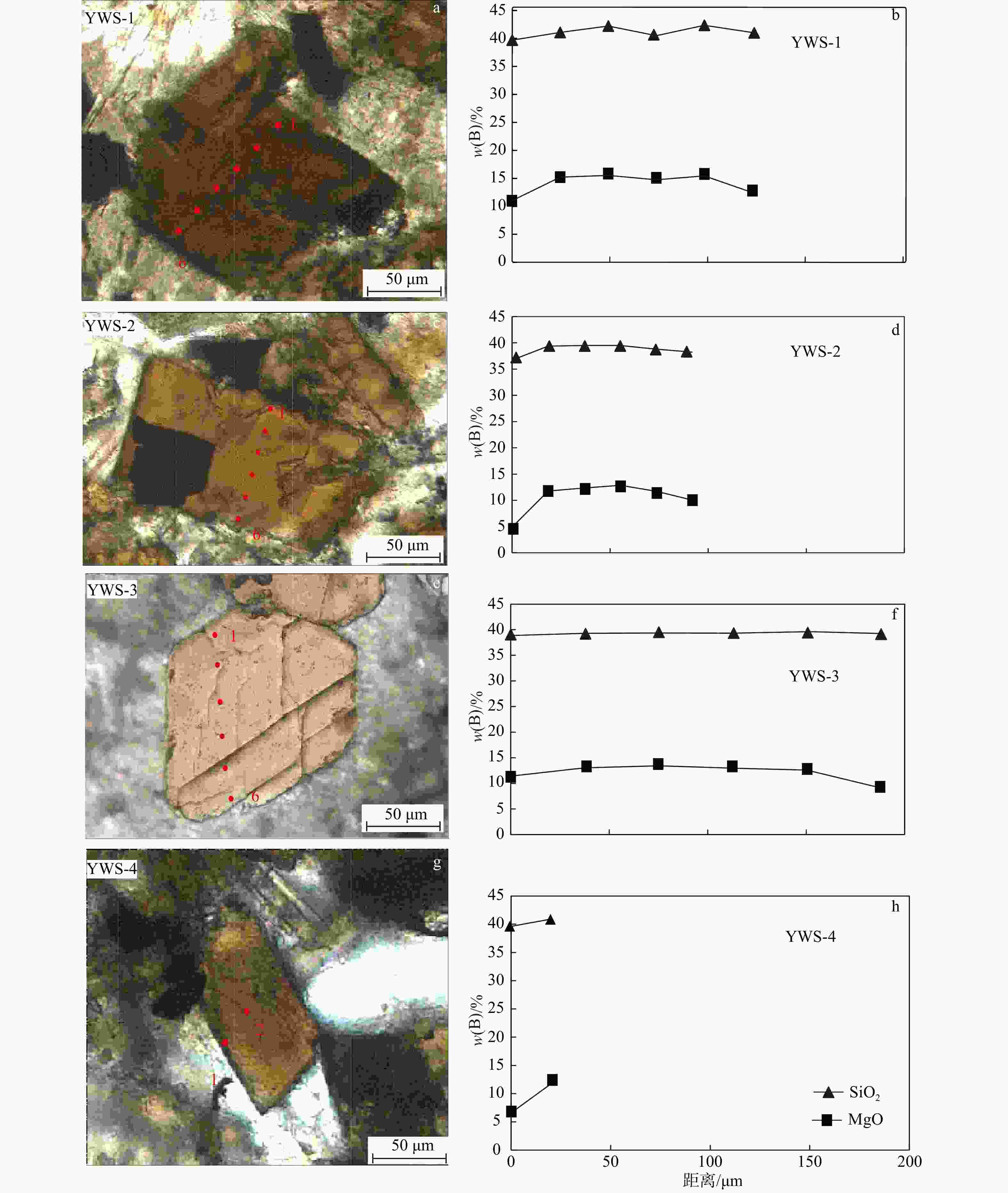 a—YWS-1相带正交偏光下的角闪石;b—YWS-1相带角闪石元素的分布;c—YWS-2相带正交偏光下的角闪石;d—YWS-2相带角闪石元素的分布;e—YWS-3相带正交偏光下的角闪石;f—YWS-3相带角闪石元素的分布;g—YWS-4相带正交偏光下的角闪石;h—YWS-4相带角闪石元素的分布