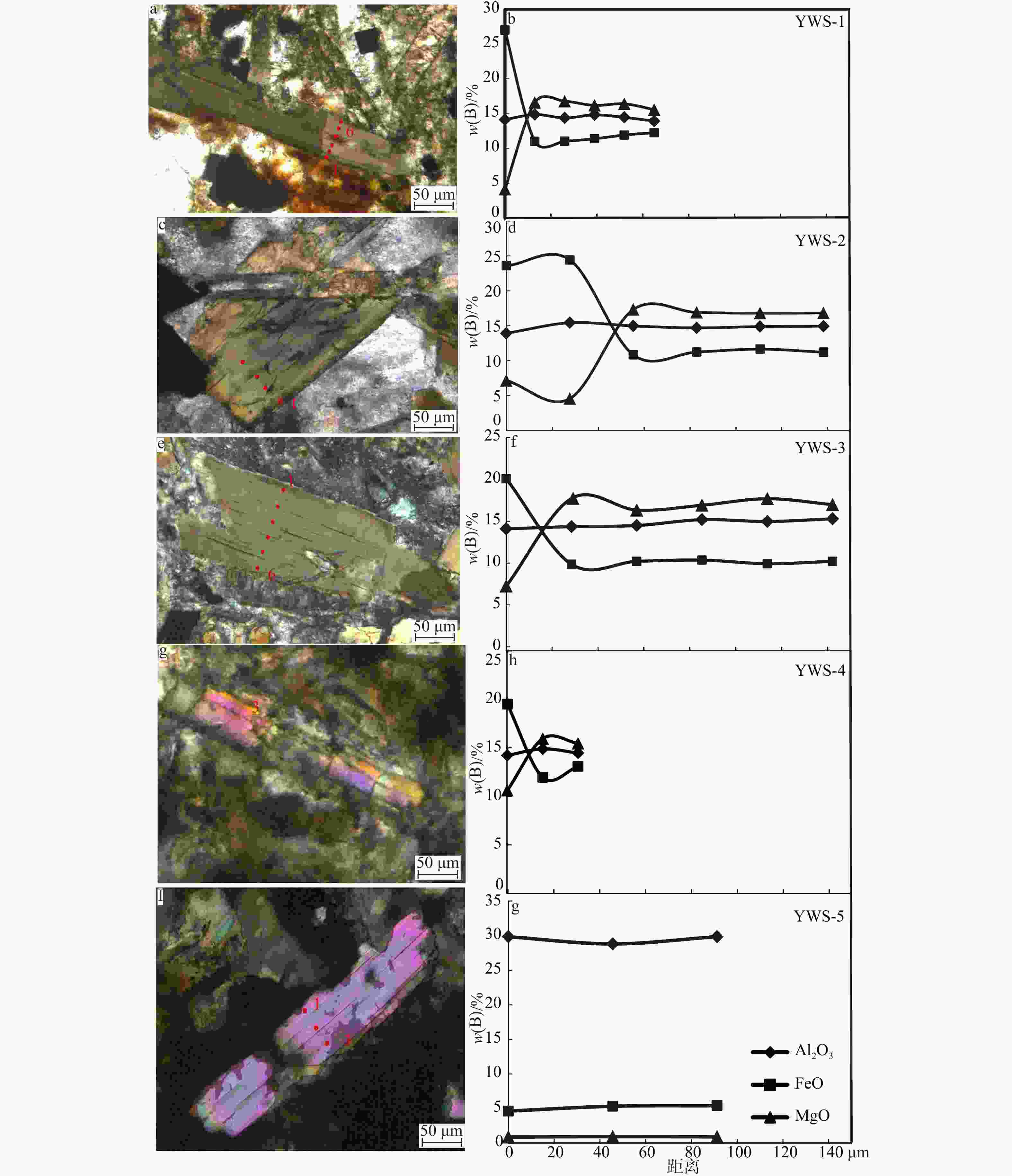 a—YWS-1相带正交偏光下的云母;b—YWS-1相带云母元素的分布;c—YWS-2相带正交偏光下的云母;d—YWS-2相带云母元素的分布;e—YWS-3相带正交偏光下的云母;f—YWS-3相带云母元素的分布;g—YWS-4相带正交偏光下的云母;h—YWS-5相带云母元素的分布;i—YWS-5相带正交偏光下的云母;j—YWS-5相带云母元素的分布