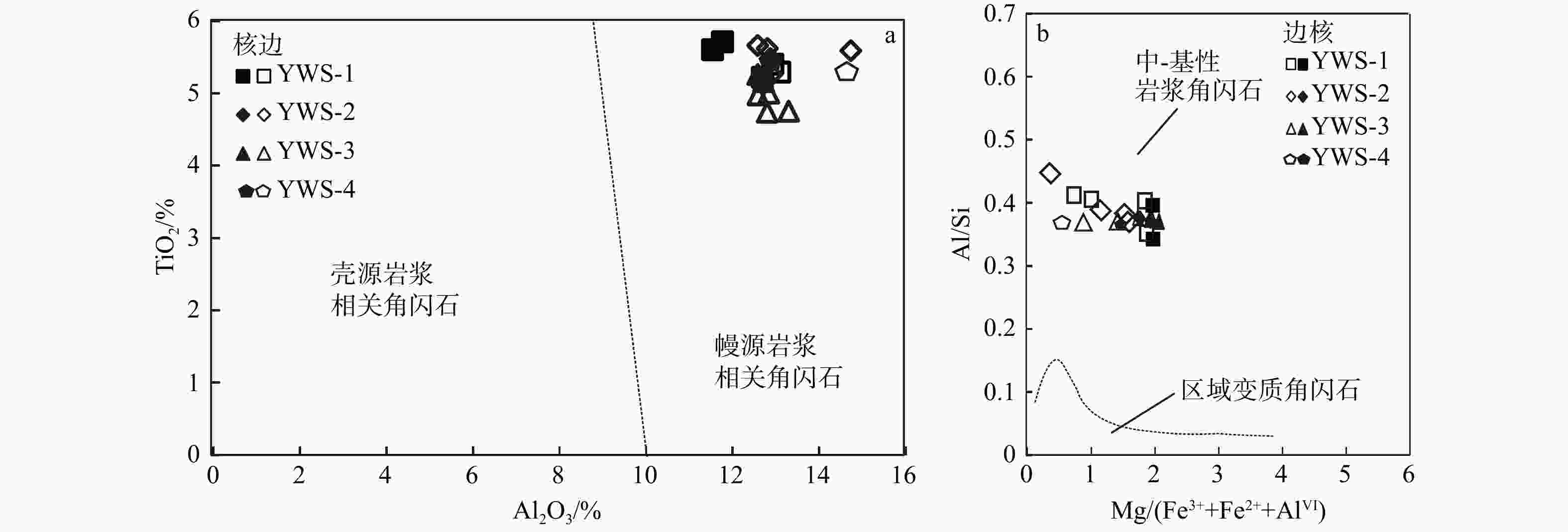 图  4  YWS-1相带—YWS-4相带角闪石成分分布(据Leake et al.,1997修改)