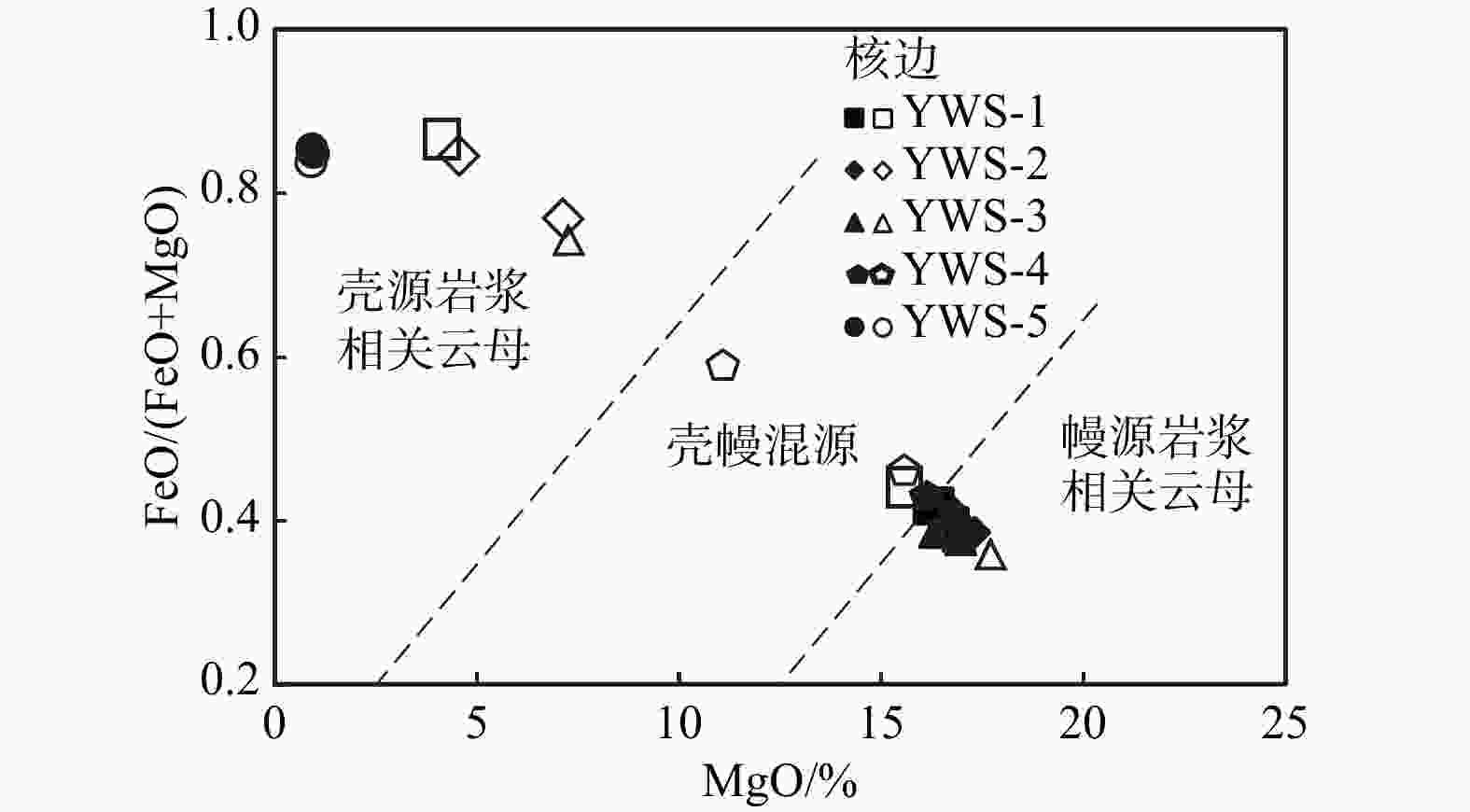 图  9  YWS-1 相带— YWS-5相带云母成因判别图解(Foster,1960