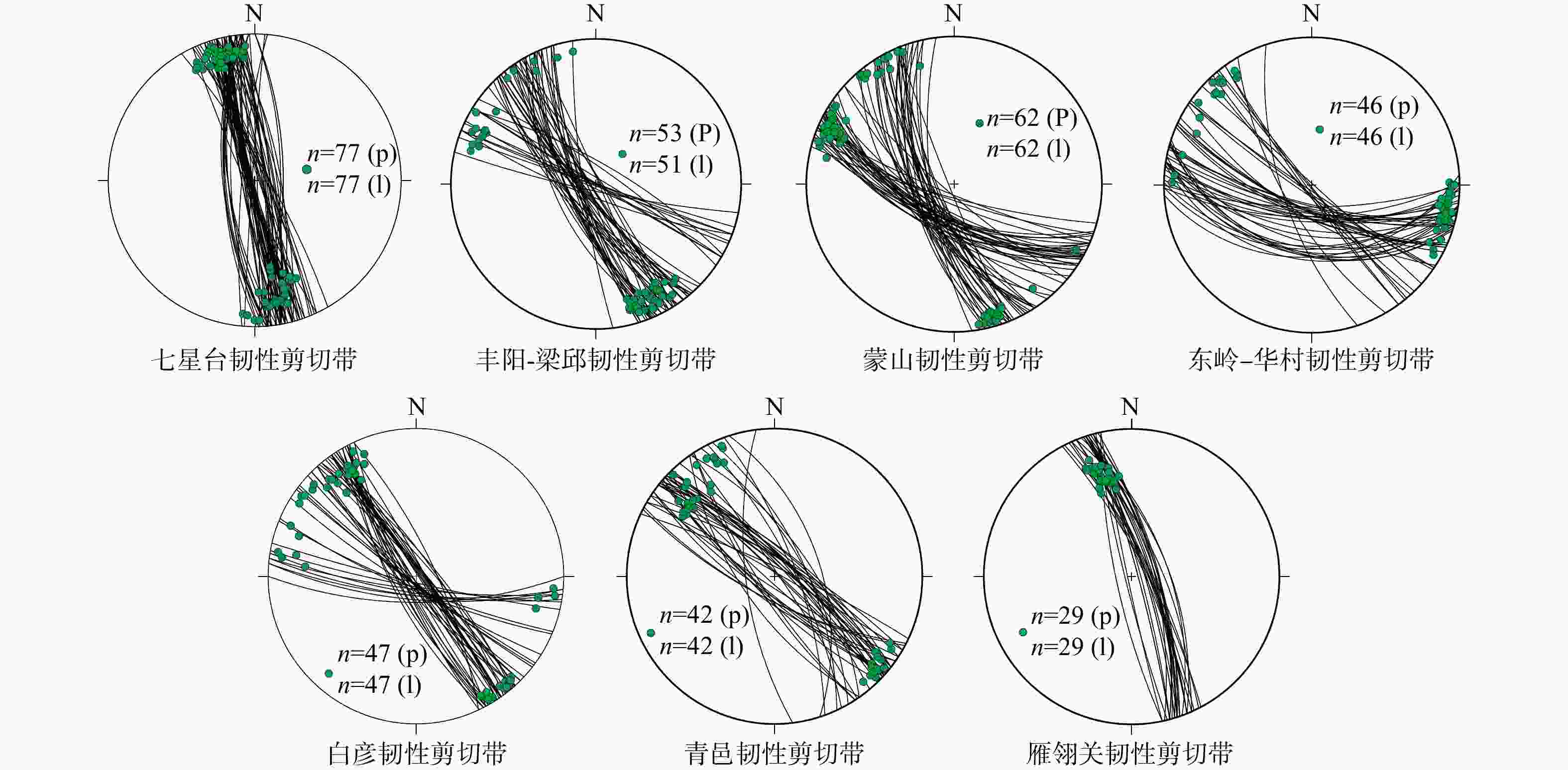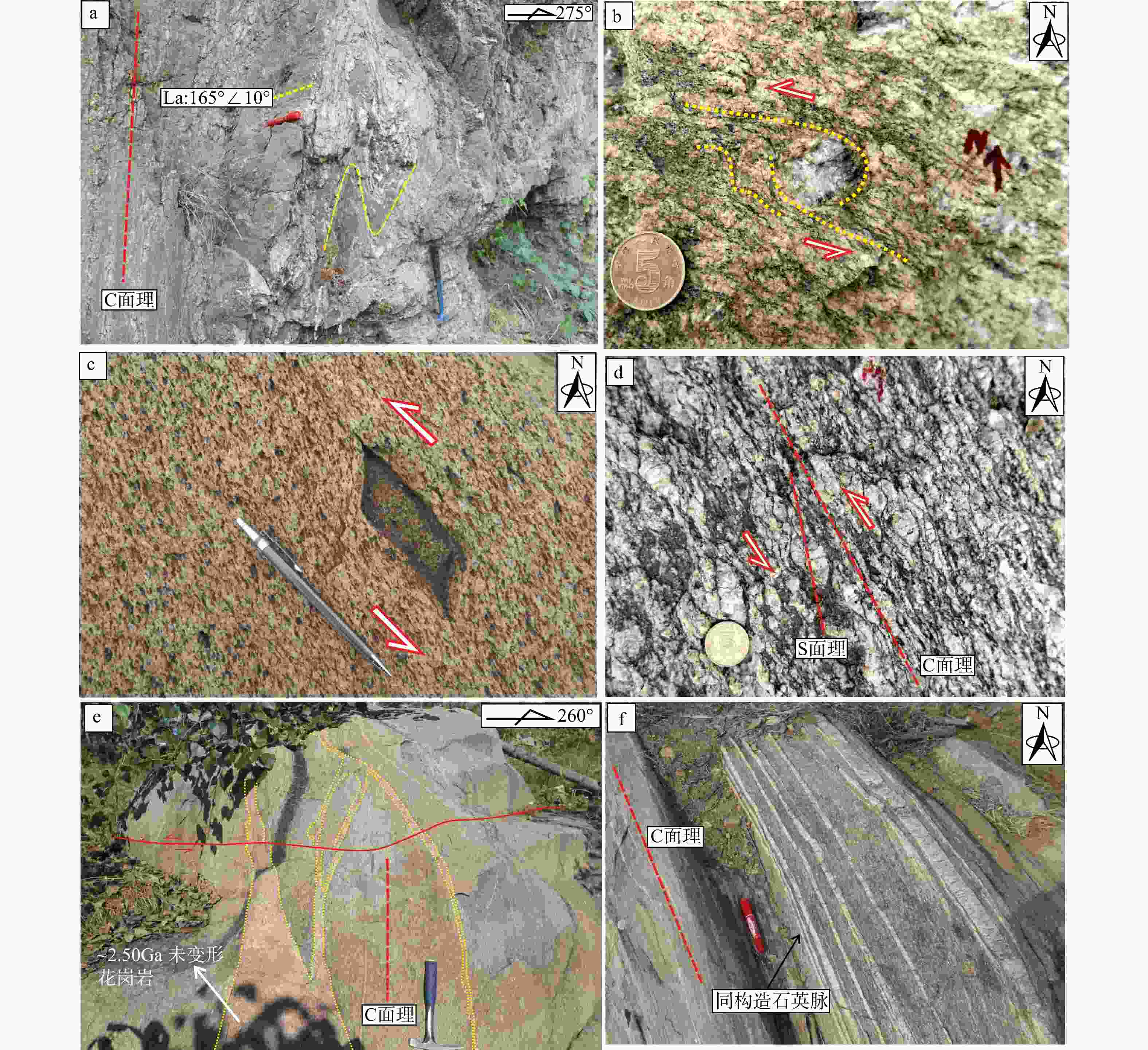 La—矿物拉伸线理a—七星台韧性剪切带中陡倾面理及近水平矿物拉伸线理,枢纽与线理平行的A型褶皱;b—东岭‒华村韧性剪切带斜长石旋转碎斑指示左行剪切;c—白彦韧性剪切带内斜长角闪岩捕虏体经受变形改造,指示左行剪切;d—蒙山韧性剪切带内S-C组构指示左行剪切;e—侵入青邑韧性剪切带未变形的细粒花岗岩脉,测年数据引自Wang et al.(2024a);f—丰阳‒梁邱韧性剪切带中平行于剪切面理的同构造石英脉