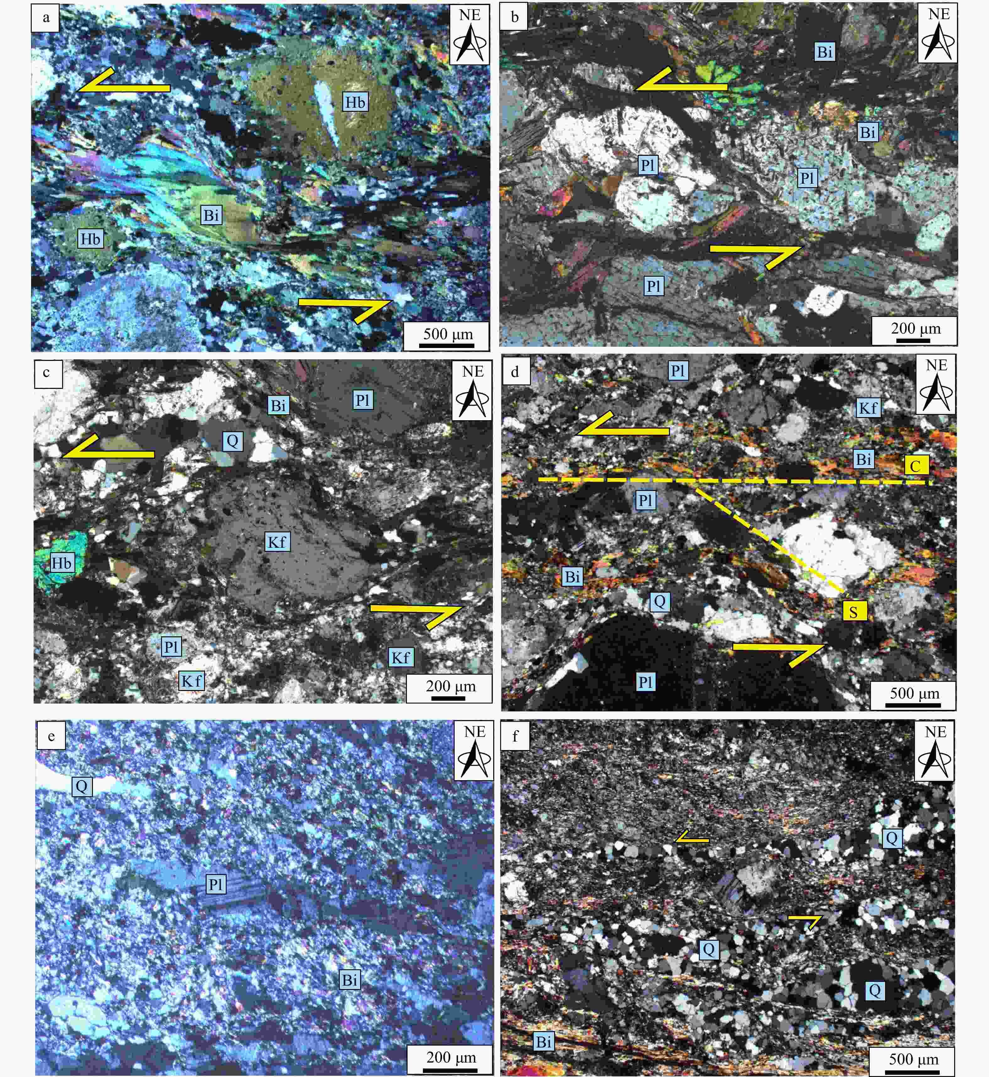 Hb—角闪石;Bi—黑云母;Pl—斜长石;Q—石英;Kf—钾长石a—白彦韧性剪切带内云母鱼、角闪石旋转碎斑指示左行剪切;b—蒙山韧性剪切带斜长石书斜构造;c—丰阳—梁邱韧性剪切带斜长石旋转碎斑,指示左行剪切;d—七星台韧性剪切带中S-C组构指示左行剪切,C面理由石英多晶条带和黑云母定向排列构成;e—丰阳—梁邱韧性剪切带内斜长石拉长变形;f—七星台韧性剪切带内多晶石英条带,长石旋转碎斑指示左行剪切