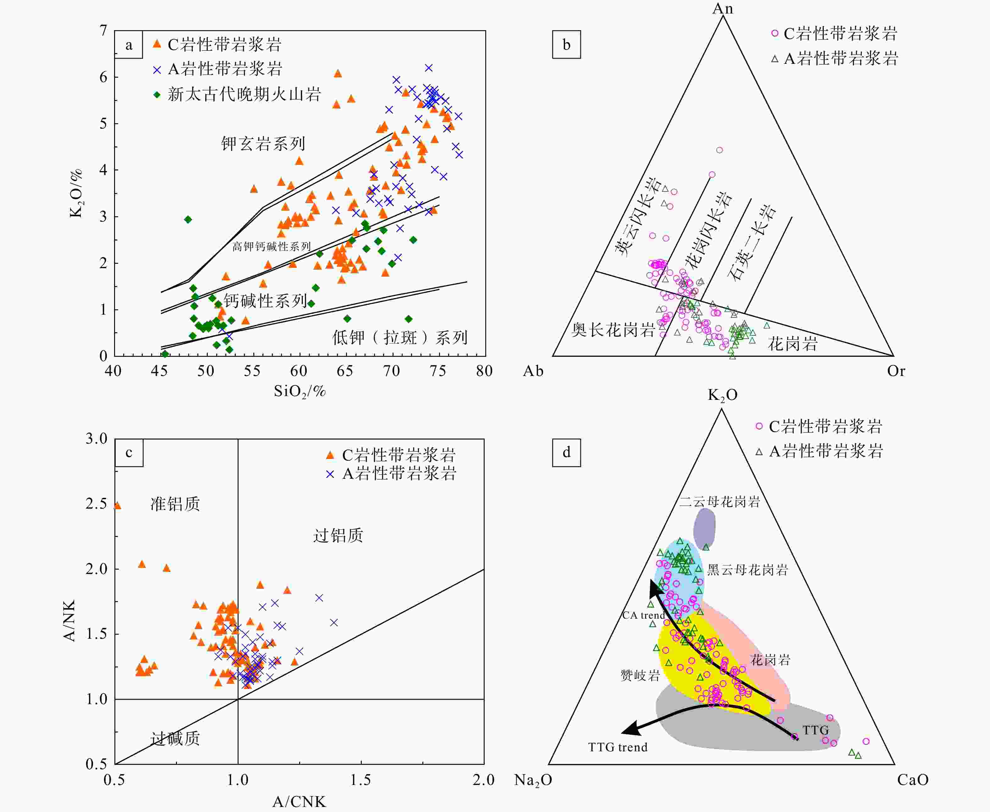 新太古代晚期火山岩数据引自Wang et al.(2013c)、Gao et al.(2020);C岩性带岩浆岩数据引自Sun et al.(2019a,2020)、Wang et al.(2017b)、Peng et al.(2012)、Yu et al.(2021);A岩性带岩浆岩数据引自Wang et al.(2017b)、Wan et al.(2012b)、Gao et al.(2018)、Sun et al.(2020)a—SiO2-K2O分类图解(Laurent et al.,2013);b—An-Ab-Or分类图解(O’Connor,1965);c—A/NK-A/CNK图解(Maniar and Piccoli,1989);d—K2O-Na2O-CaO三角图解(Moyen et al.,2003;CA—岩浆富碱演化趋势)