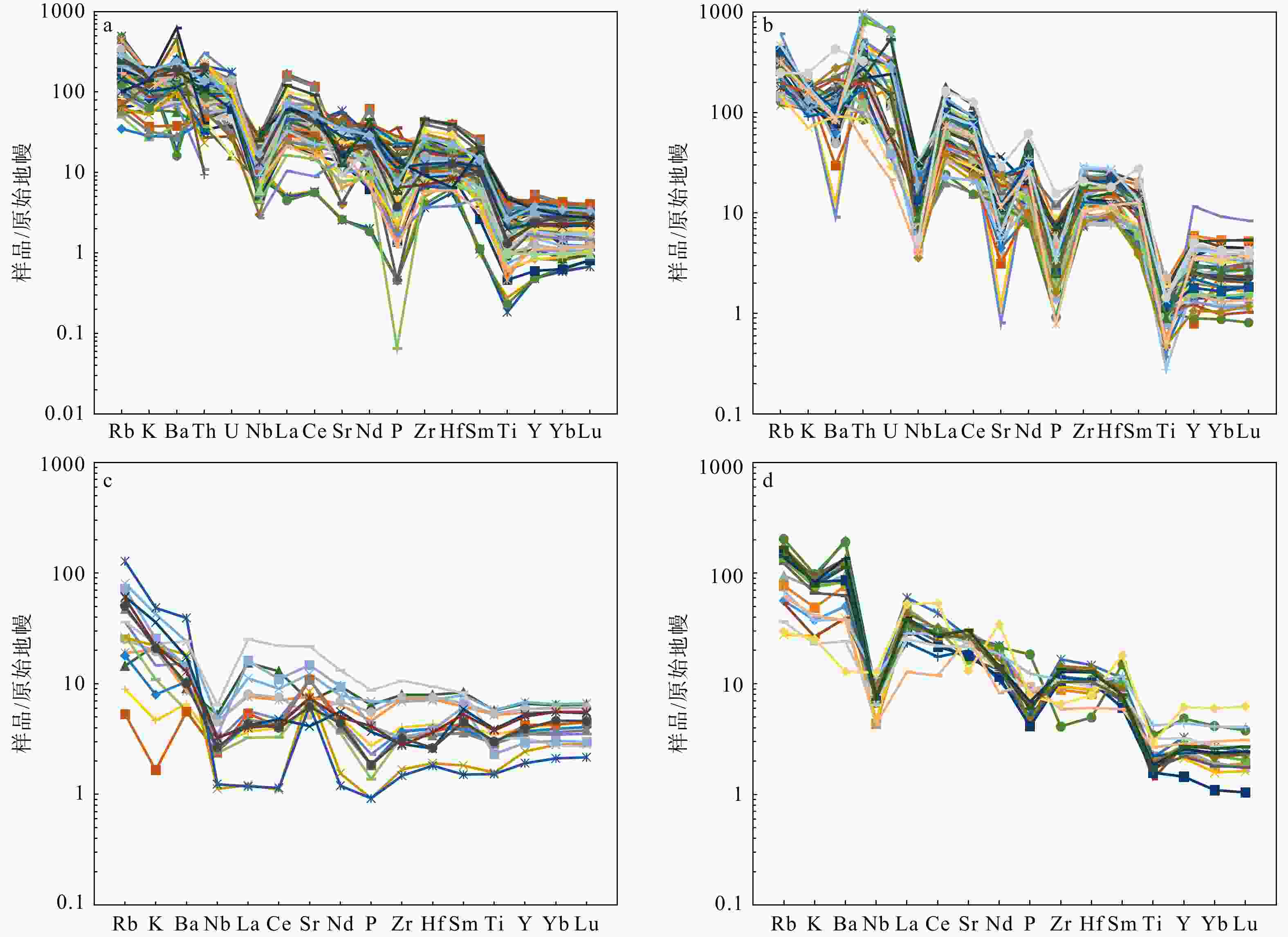 图 6 原始地幔标准化微量元素蛛网图(数据来源同图4)