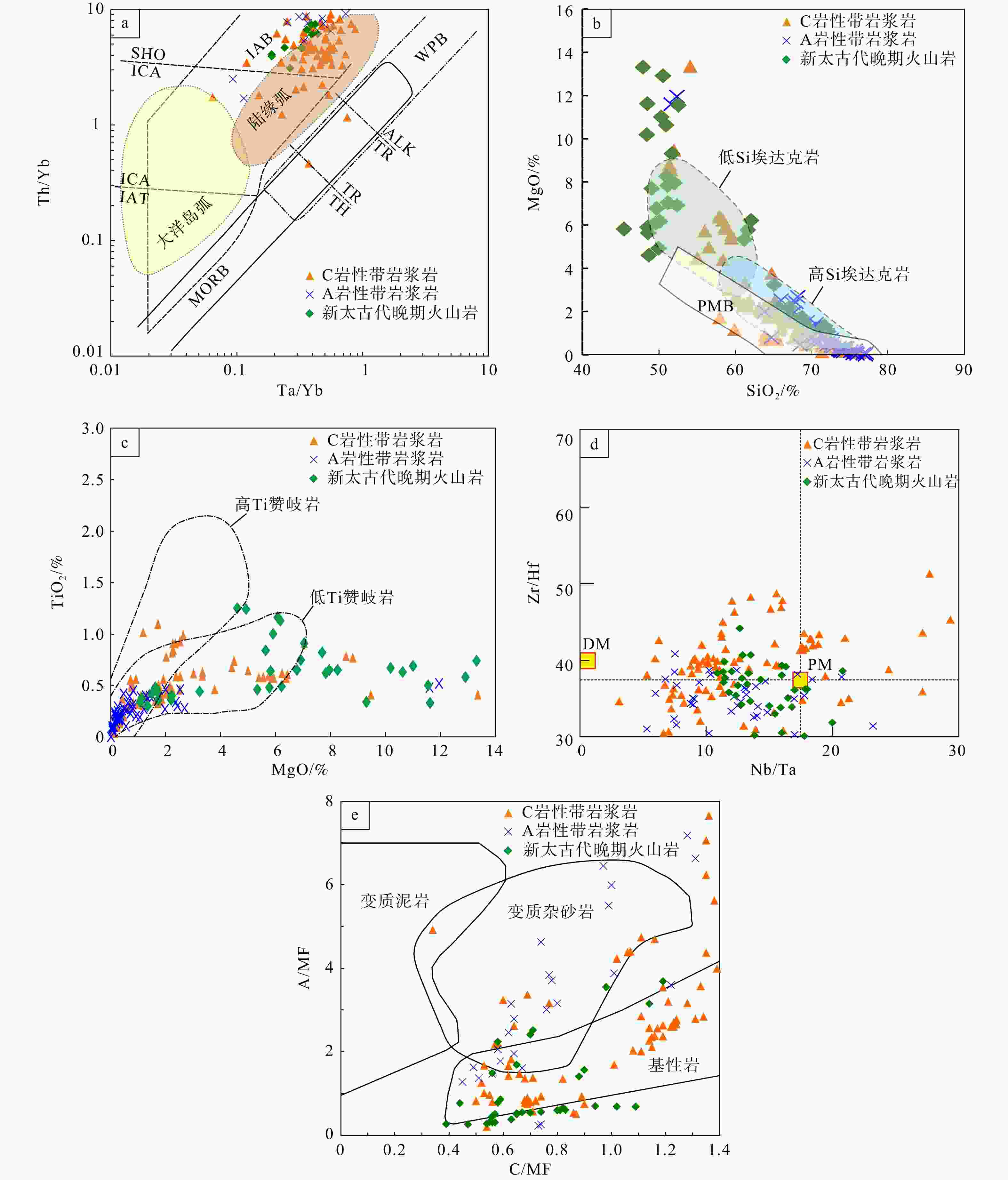 IAB—岛弧玄武岩;IAT—岛弧拉斑玄武岩;ICA—岛弧钙碱性玄武岩;WPB—板内玄武岩;ALK—碱性玄武岩;TR—过渡玄武岩;TH—拉斑玄武岩;SHO—岛弧橄榄玄粗岩;MORB—大洋中脊玄武岩;N-MORB—正常型洋中脊玄武岩;E-MORB—富集型洋中脊玄武岩;①PMB—由玄武岩或角闪岩的部分熔融的熔体;②PM为原始地幔;③DM为亏损地幔a—Th/Yb-Ta/Yb判别图解(Pearce,1983);b—MgO-SiO2判别图解(Martin et al.,2005);c—Nb/Ta-Zr/Hf判别图解(数据引自Mcdonough,2003);d—TiO2-MgO赞岐岩判别图解(Martin et al.,2009);e—A/FM-C/FM岩浆源区判别图解(Altherr et al.,2000)