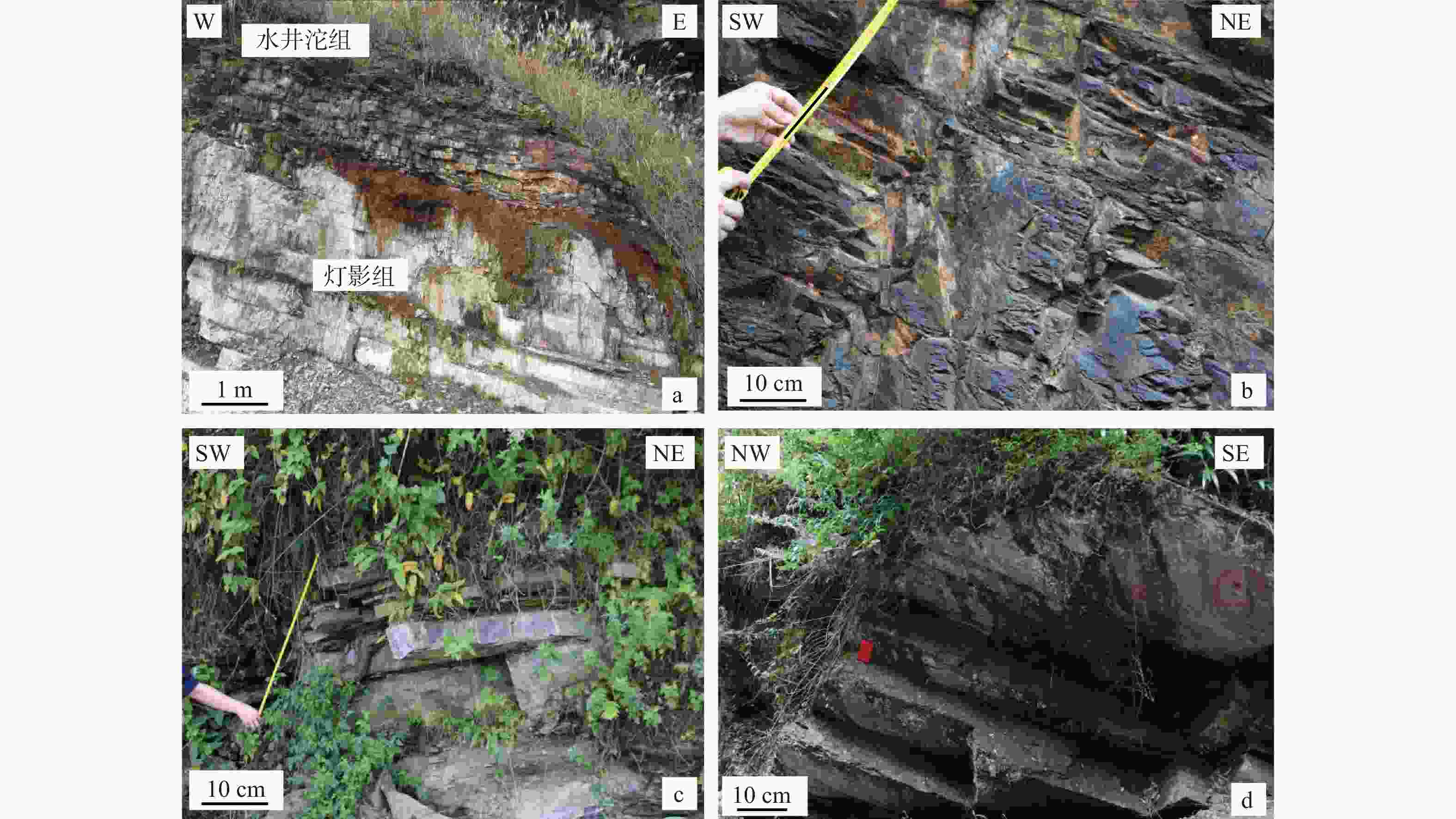 a—宜昌鹤峰水井沱组与灯影组间平行不整合;b—宜昌滚石坳剖面水井沱组富有机质泥岩;c—宜昌滚石坳剖面水井沱组上部中—厚层灰岩夹薄层泥页岩;d—宜昌秭归泗溪剖面石牌组厚层灰黄色泥岩夹粉砂岩