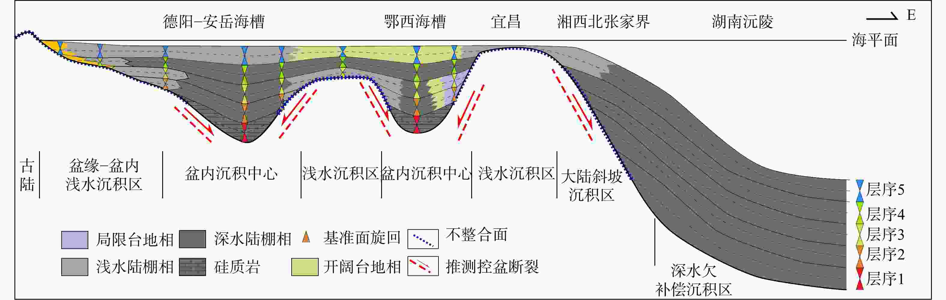 Objective The organic-rich shales of the Lower Cambrian in South China are characterized by significant thickness and high thermal maturity. Recent explorations have yielded industrial gas flows from the Lower Cambrian shales in the Middle Yangtze region. To further investigate the shale gas resource potential of the Lower Cambrian in South China, this study focuses on the Lower Cambrian Shuijingtuo Formation in the Middle Yangtze region. Methods Through an integrated analysis of outcrop observations and drilling data, we analyzed its sedimentary characteristics and processes. A third-order stratigraphic sequence framework for the Lower Cambrian shale was established, and a sedimentary model of the Early Cambrian E’Xi Trough in the Middle Yangtze region was constructed, clarifying exploration targets. Results The Lower Cambrian Shuijingtuo Formation in the Middle Yangtze region primarily consists of shallow-water and deep-water shelf facies, with shallow carbonate deposits at both the bottom and top. The Lower Cambrian organic-rich shales can be divided into five third-order sequences, which are correlatable with those in the Upper Yangtze region. The Shuijingtuo Formation formed during the filling stage of the E’xi Trough, primarily consisting of argillaceous clastic sedimentary rocks. Conclusion Organic-rich shales are distributed in deep-water facies, with two identified subsags within the E’xi Trough (the Enshi and Yichang–Changyang depressions) serving as key exploration targets. The Lower Cambrian Shuijingtuo Formation, together with the underlying Sinian Dengying and Doushantuo Formations, forms a "sandwich-like" conventional hydrocarbon assemblage, which is a priority area for future conventional oil and gas exploration in Western Hubei. -
