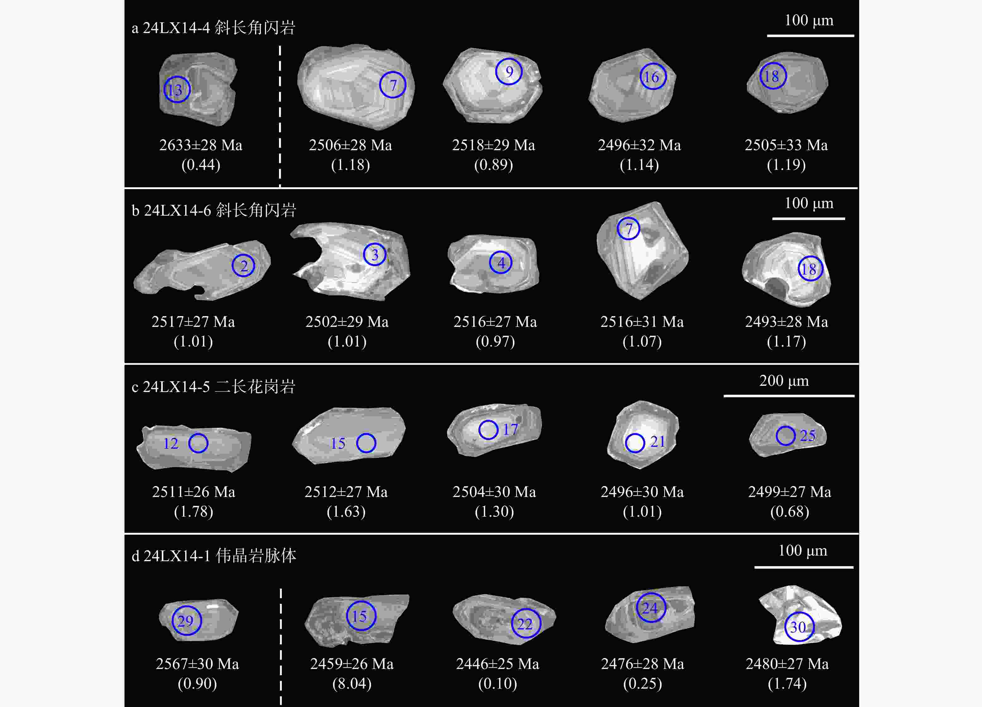 (a) Amphibolite (sample 24LX14-4); (b) Amphibolite (sample 24LX14-6); (c) Syn-tectonic medium-to- coarse-grained monzogranite (sample 24LX14-5); (d) Undeformed pegmatite vein (sample 24LX14-1) Blue circles represent U–Pb dating spots; Numbers in parentheses represent Th/U ratios.