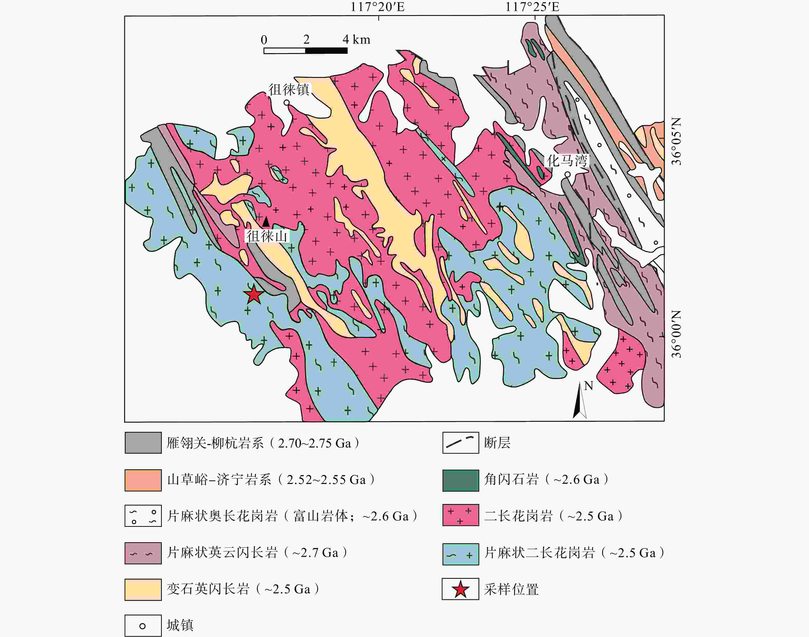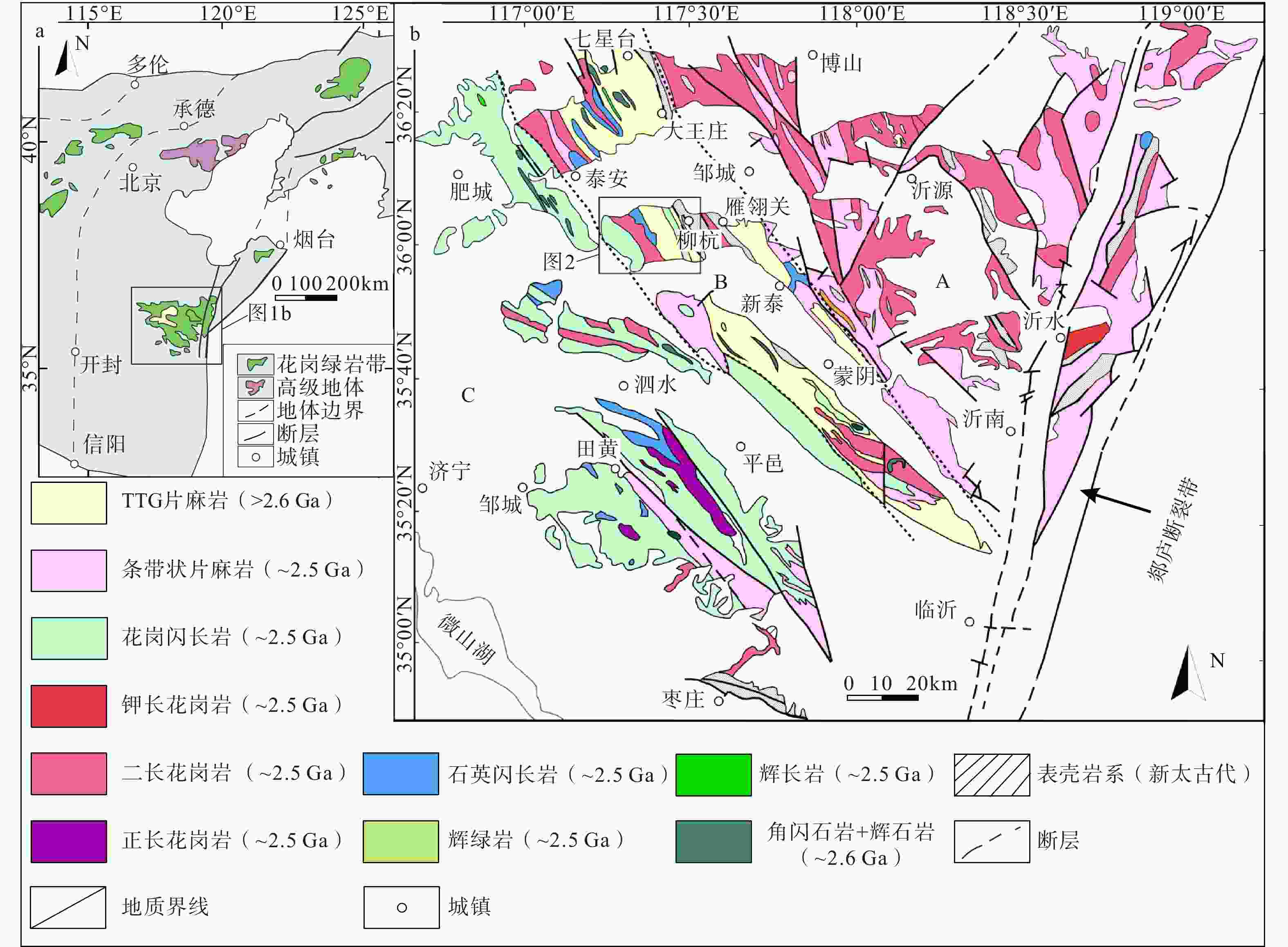 图1b中黑色虚线为 Wan et al.(2010,2015)划分A、B、C三带的分界线;A带为新太古代晚期壳源花岗岩(2525~2490 Ma),B带为新太古代早期岩石(2750~2600 Ma),C带为新太古代晚期新生岩浆岩(2550~2500 Ma)a—华北克拉通东部陆块太古宙基底分布图(据Wang et al.,2013修改);b—鲁西地区花岗−绿岩带地质图(据Wan et al.,2010,2015修改)
