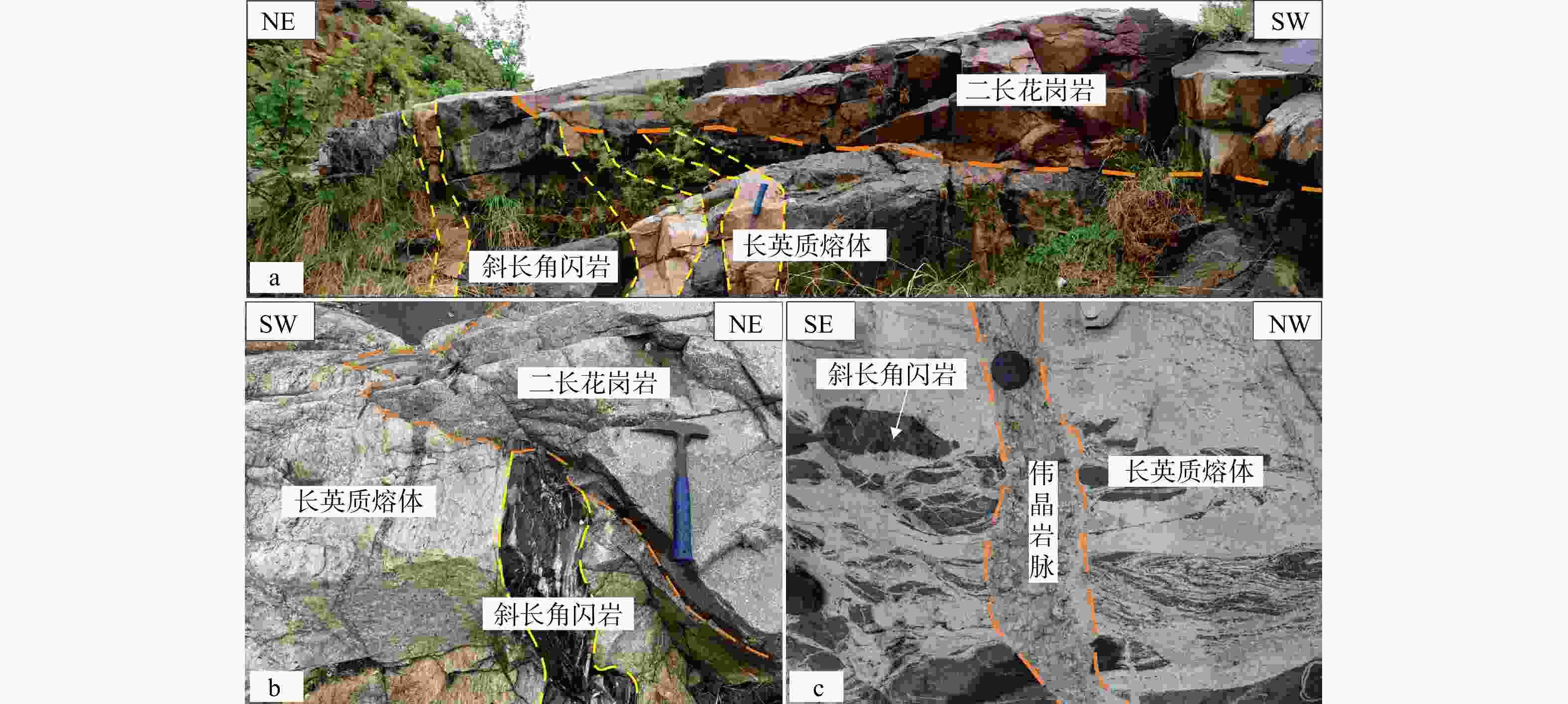 黄色与橙色虚线代表岩性分界线a—多期岩浆事件截切关系剖面图;b—块状二长花岗岩截切斜长角闪岩和长英质熔体;c—未变形伟晶岩脉截穿斜长角闪岩和长英质熔体的主体面理