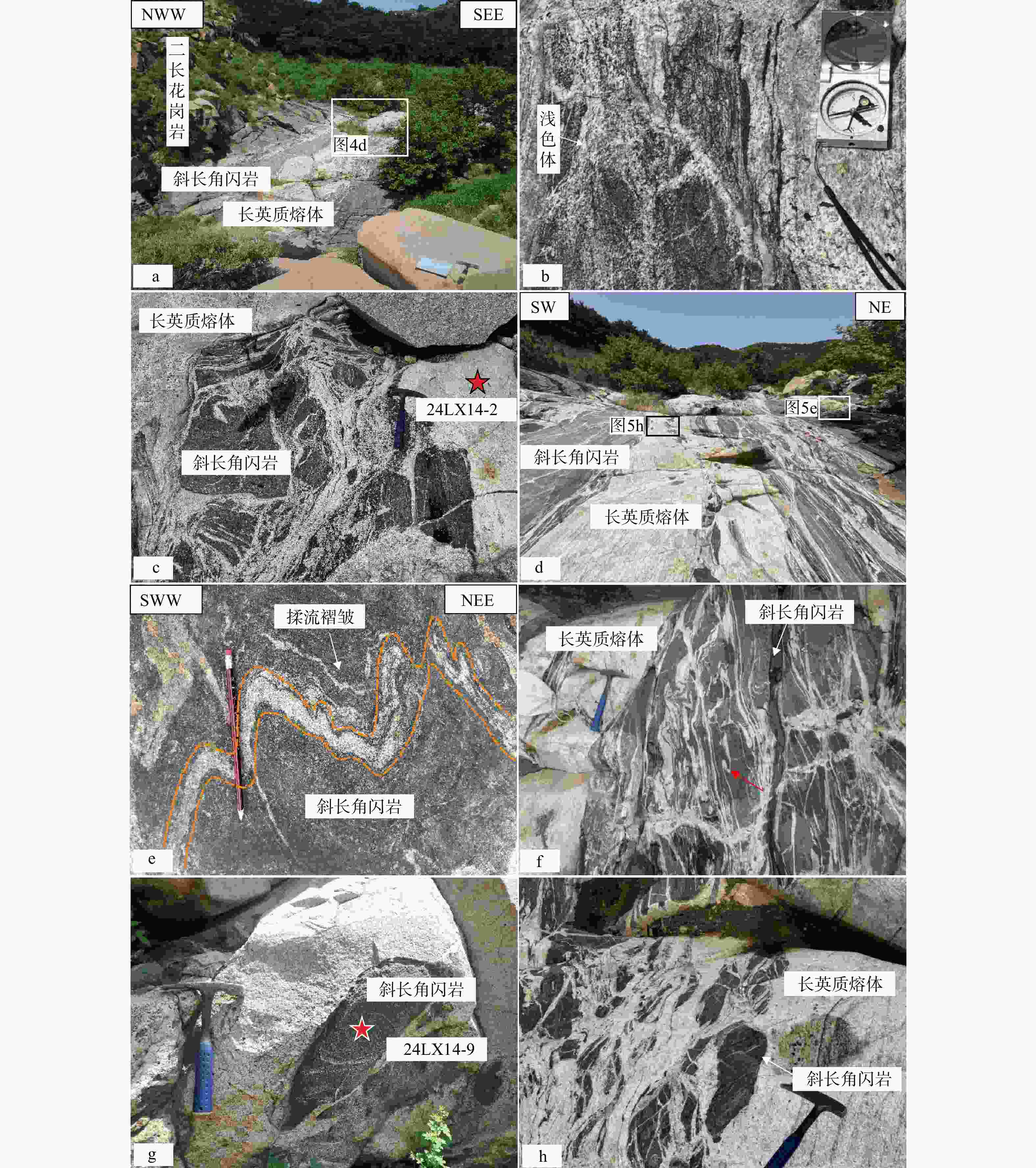 红色五角星为样品24LX14-2和24LX14-9的采样位置;橙色虚线代表揉流褶皱的轮廓线a—黄石崖村沟底露头俯瞰图;b—浅色体呈浸染状产于斜长角闪岩中(俯视);c—浅色体呈相互贯穿的网状构造(俯视);d—浅色体呈条带状产于斜长角闪岩中;e—长英质脉体发育揉流褶皱(俯视);f—脉体褶皱转折端增厚,见红色箭头处(俯视);g—斜长角闪岩包体单个产出;h—斜长角闪岩包体成群产出(俯视)