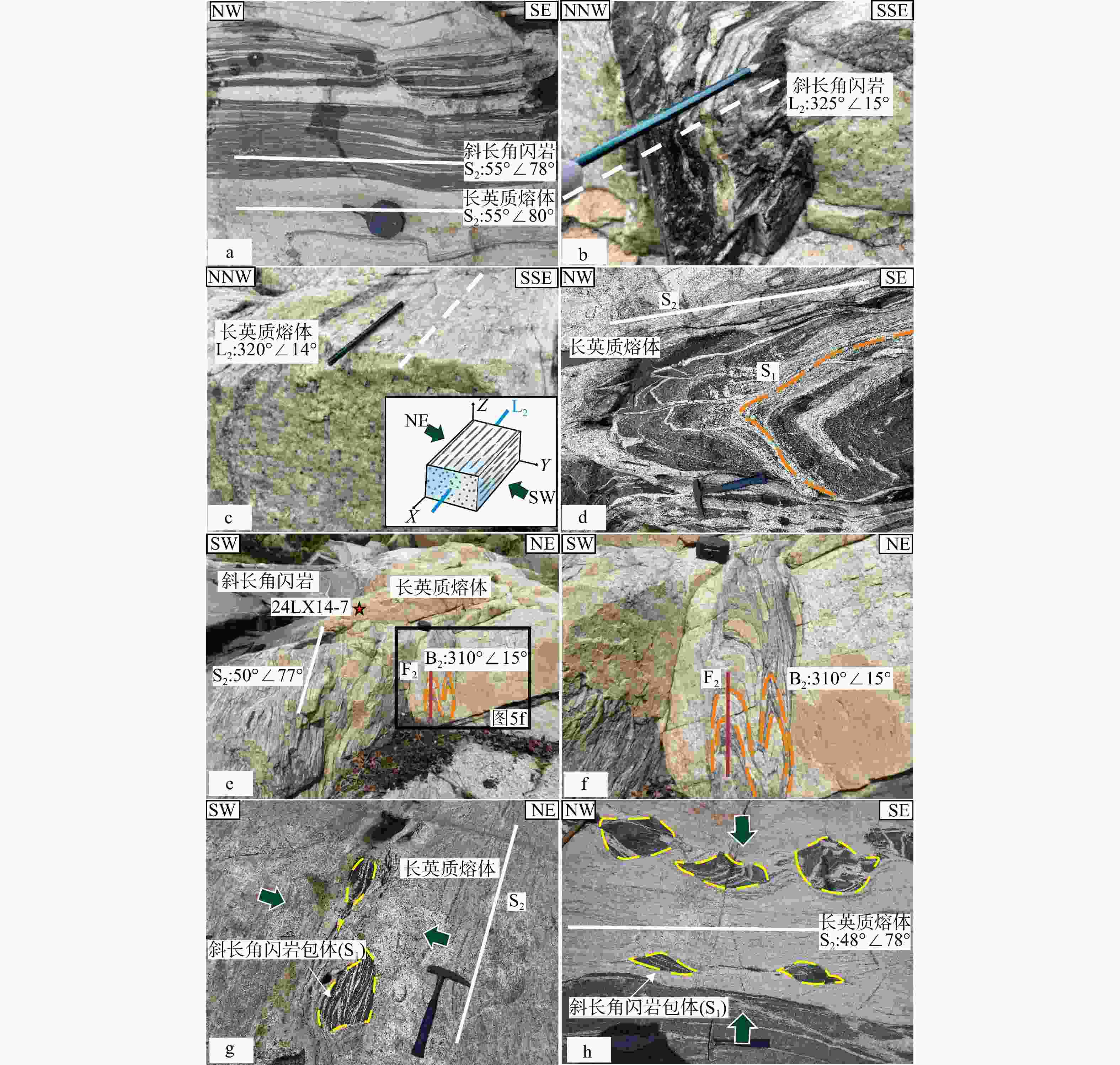 S1—早期面理; S2—晚期面理;L2—晚期线理; F2—区域第2期变形事件形成的褶皱;B2—区域第2期变形事件的褶皱枢纽白色实线代表晚期S2面理;白色虚线代表晚期L2线理;橙色虚线代表早期S1面理;红色五角星为样品24LX14-7的采样位置;红色实线代表轴迹;黄色虚线代表包体轮廓;绿色箭头代表挤压应力方向a—强烈变形发育近直立面理的斜长角闪岩和长英质熔体;b—斜长角闪岩中发育的近水平线理;c—L型构造岩及示意图,发育近水平线理;d—S1在强烈的F2褶皱作用下被置换成近直立的S2;e—熔体发育A型褶皱和S2面理;f—A型褶皱;g—呈布丁状构造的斜长角闪岩包体,可见残留S1面理;h—斜长角闪岩包体发育布丁构造,其内部可见残留S1面理