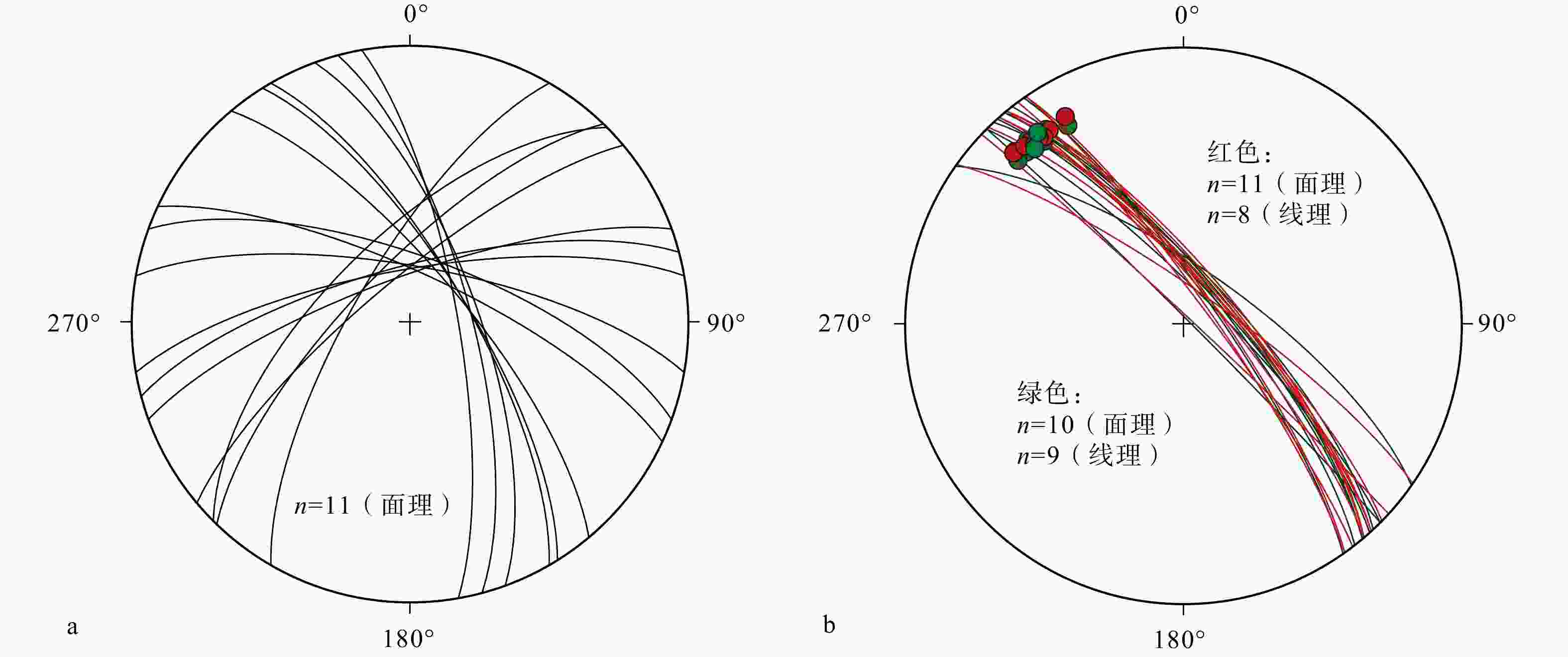 a—早期面理S1投影图;b—受到韧性变形叠加的长英质熔体(红色)和斜长角闪岩(绿色)的面理(S2)和拉伸线理(L2)投影图(图为等角度下半球投影;大圆弧线为面理投影,圆点为线理投影)