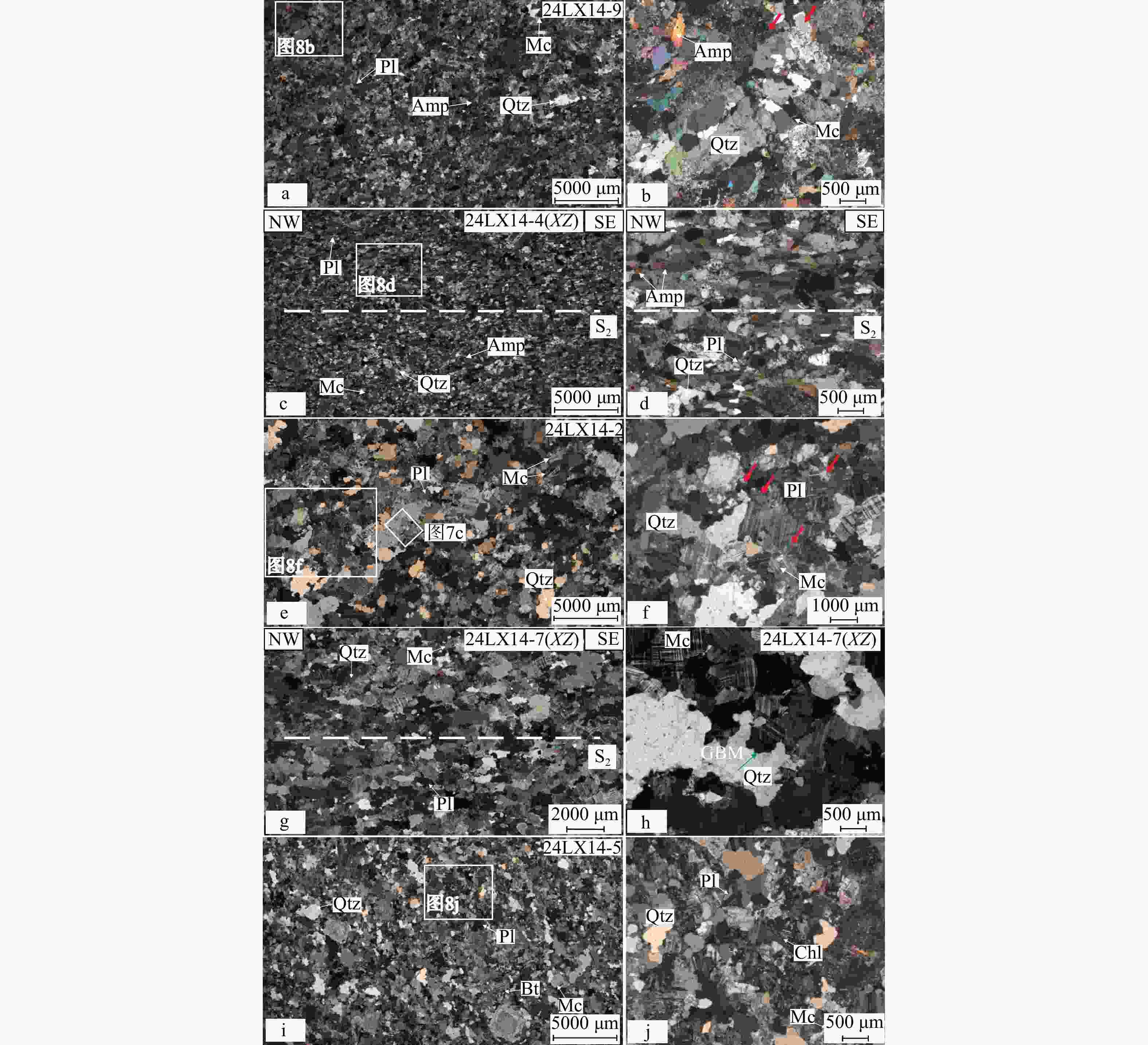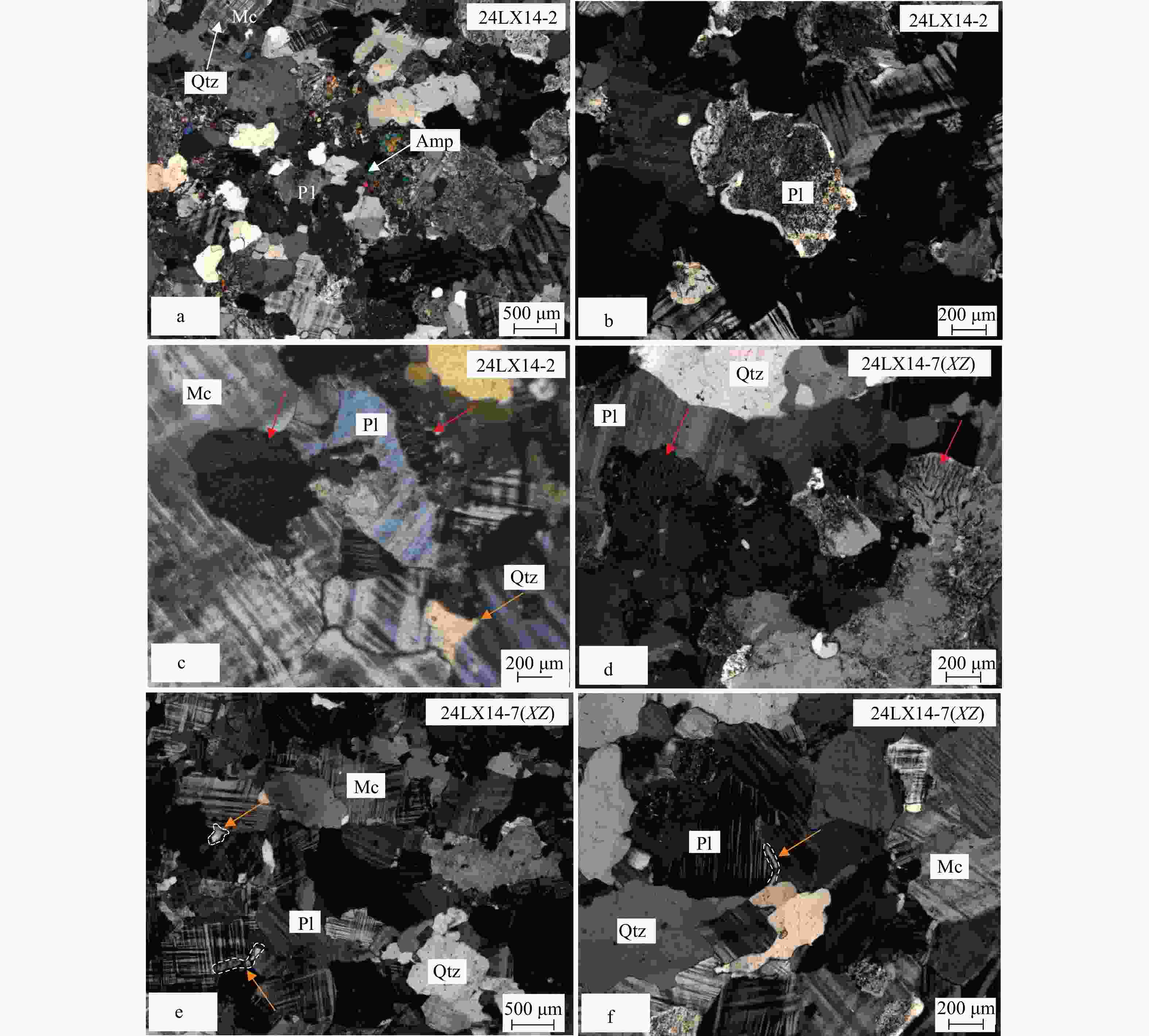Amp—角闪石;Bt—黑云母;Qtz—石英;Pl—斜长石;Mc—微斜长石;Chl—绿泥石a—弱应变域中块状斜长角闪岩(样品24LX14-9)全薄片照片,矿物无规律随机分布;b—蠕英结构(红色箭头处);c—强应变域斜长角闪岩(样品24LX14-4)全薄片照片,角闪石沿北西—南东定向分布(白色虚线代表矿物面理方向);d—局部放大照片,角闪石沿北西—南东定向分布(白色虚线代表矿物面理方向);e—弱应变域中长英质熔体(样品24LX14-2)全薄片照片,矿物不定向分布;f—蠕英结构(红色箭头处);g—强应变域长英质熔体(样品24LX14-7)全薄片照片,石英、长石多呈北西—南东定向展布,表现出波状消光的特征(白色虚线代表矿物面理方向);h—长英质熔体(样品24LX14-7)中可见石英动态重结晶(绿色箭头处);i—二长花岗岩(样品24LX14-5)全薄片照片,矿物定向明显;j—黑云母绿泥石化