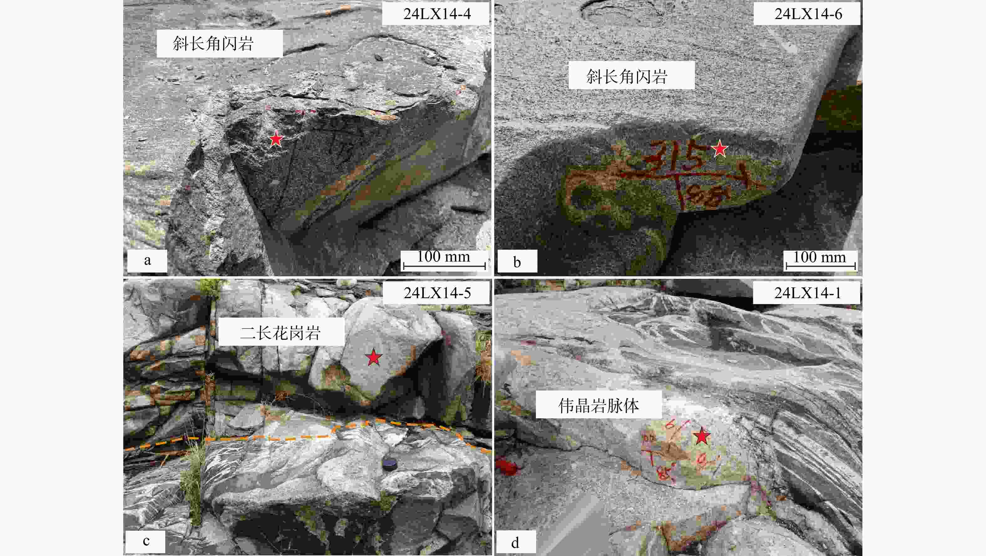 红色五角星代表样品采样位置;橙色虚线代表岩性分界线a—斜长角闪岩(样品24LX14-4);b—斜长角闪岩(样品24LX14-6);c—同构造中粗粒二长花岗岩(样品24LX14-5); d—未变形伟晶岩脉体(样品24LX14-1)