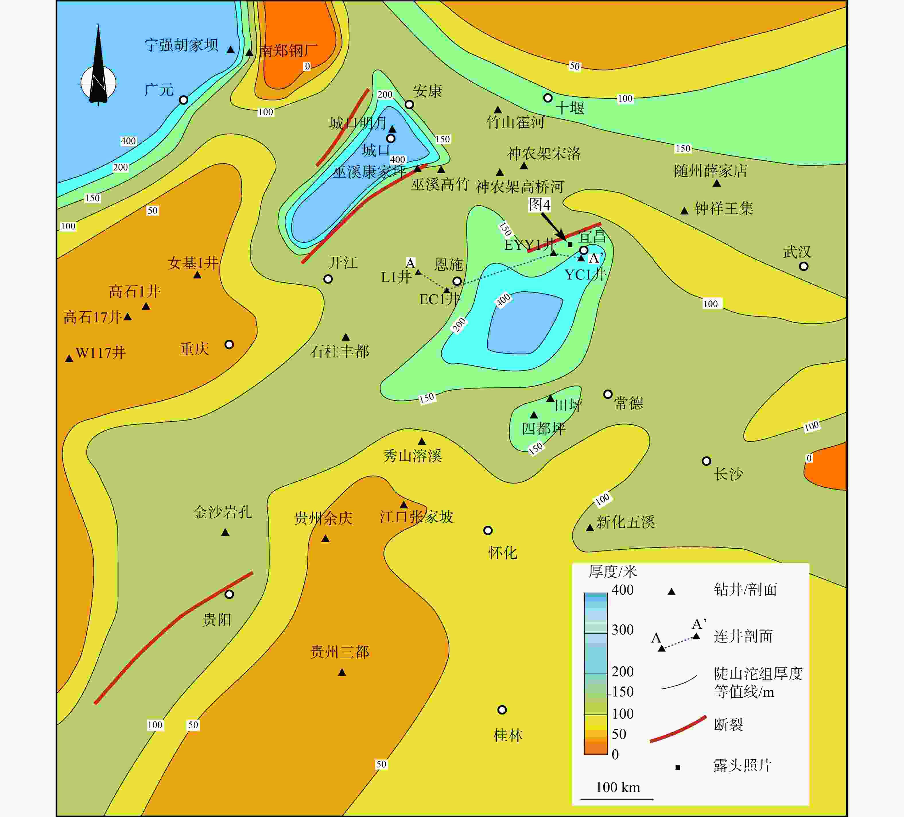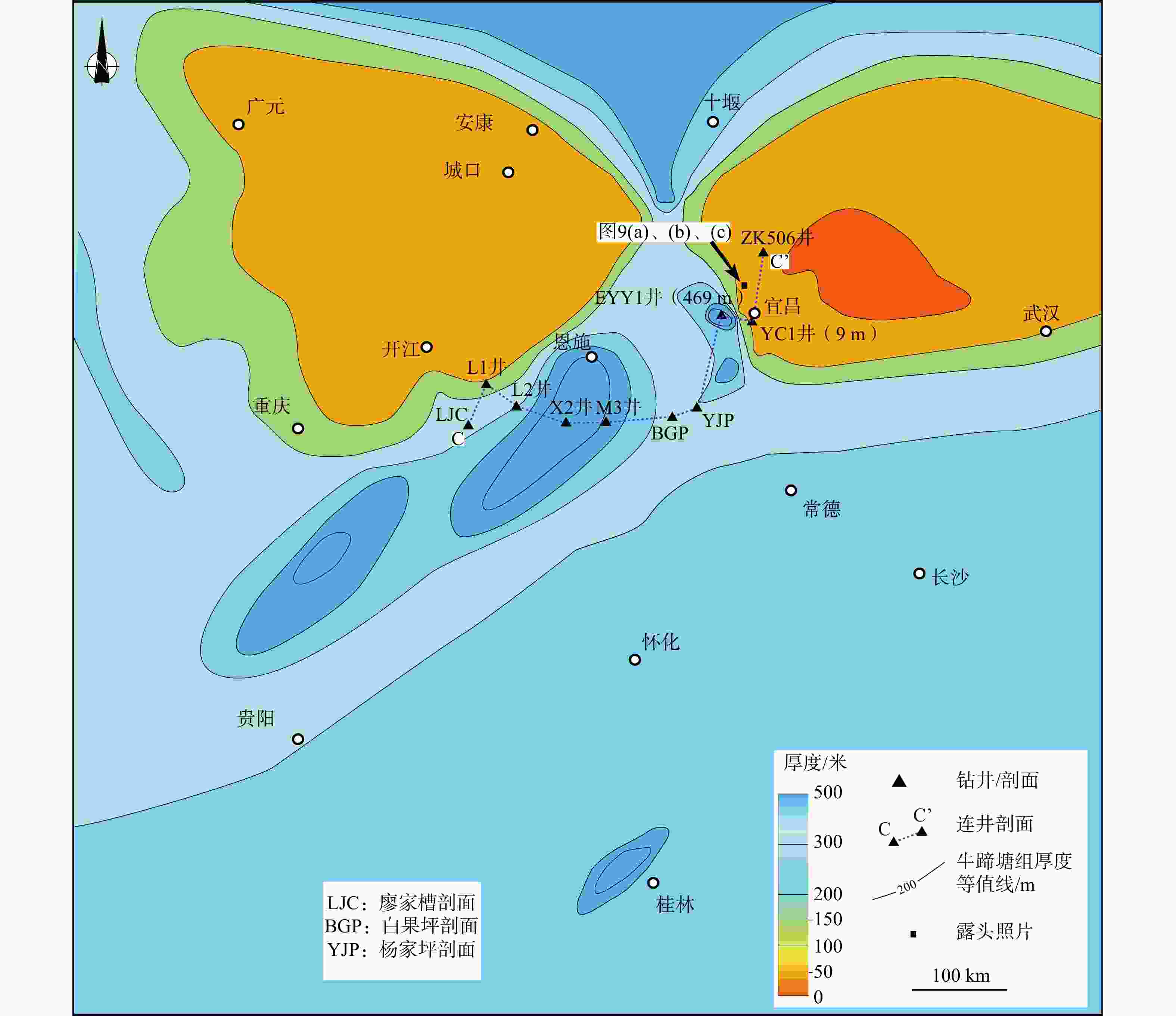 图 10 鄂西地区牛蹄塘组厚度等值线图(据陈科等,2025修改)