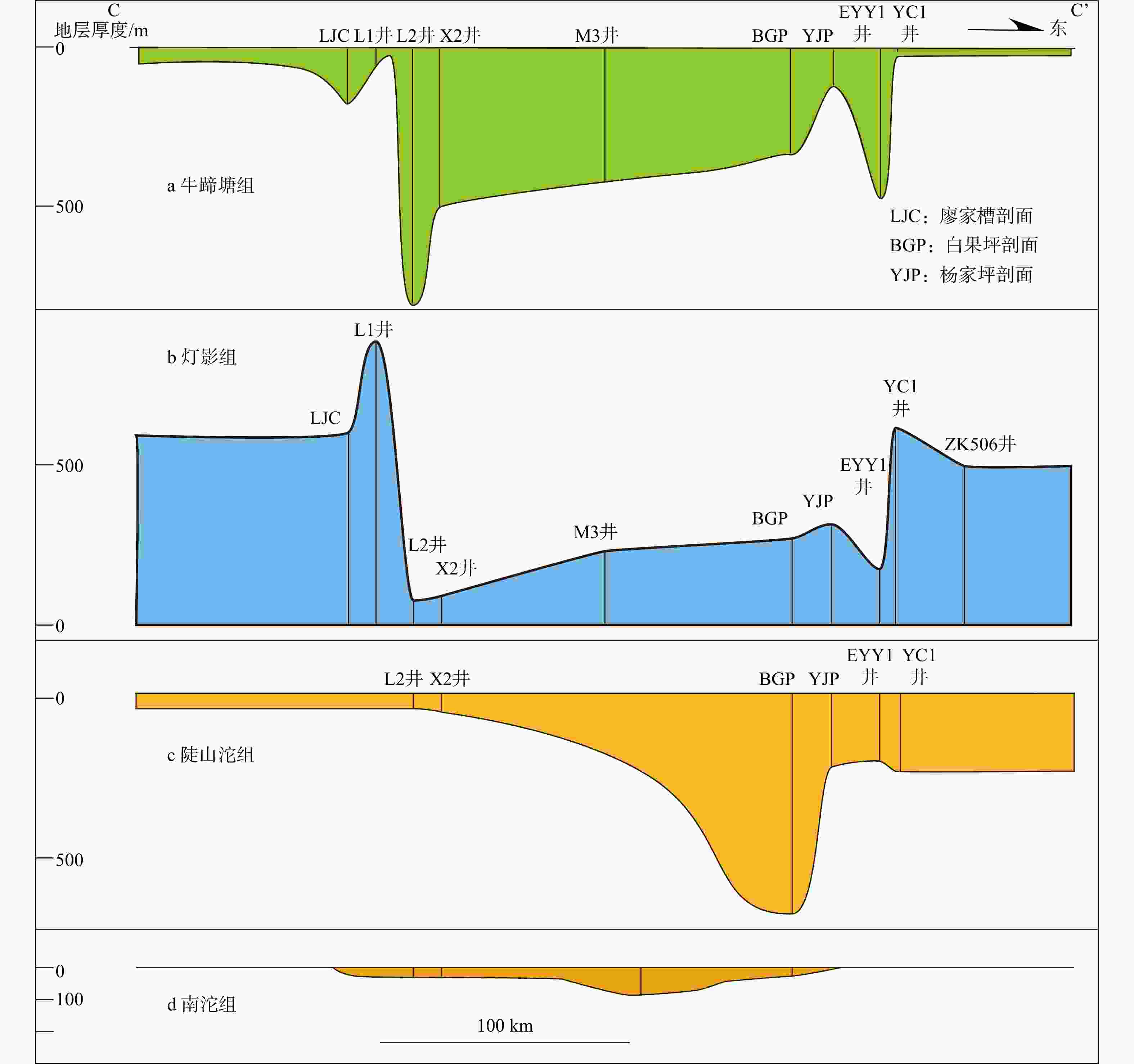 a—牛蹄塘组沉积厚度剖面;b—灯影组沉积厚度剖面;c—陡山沱组沉积厚度剖面;d—南沱组沉积厚度剖面