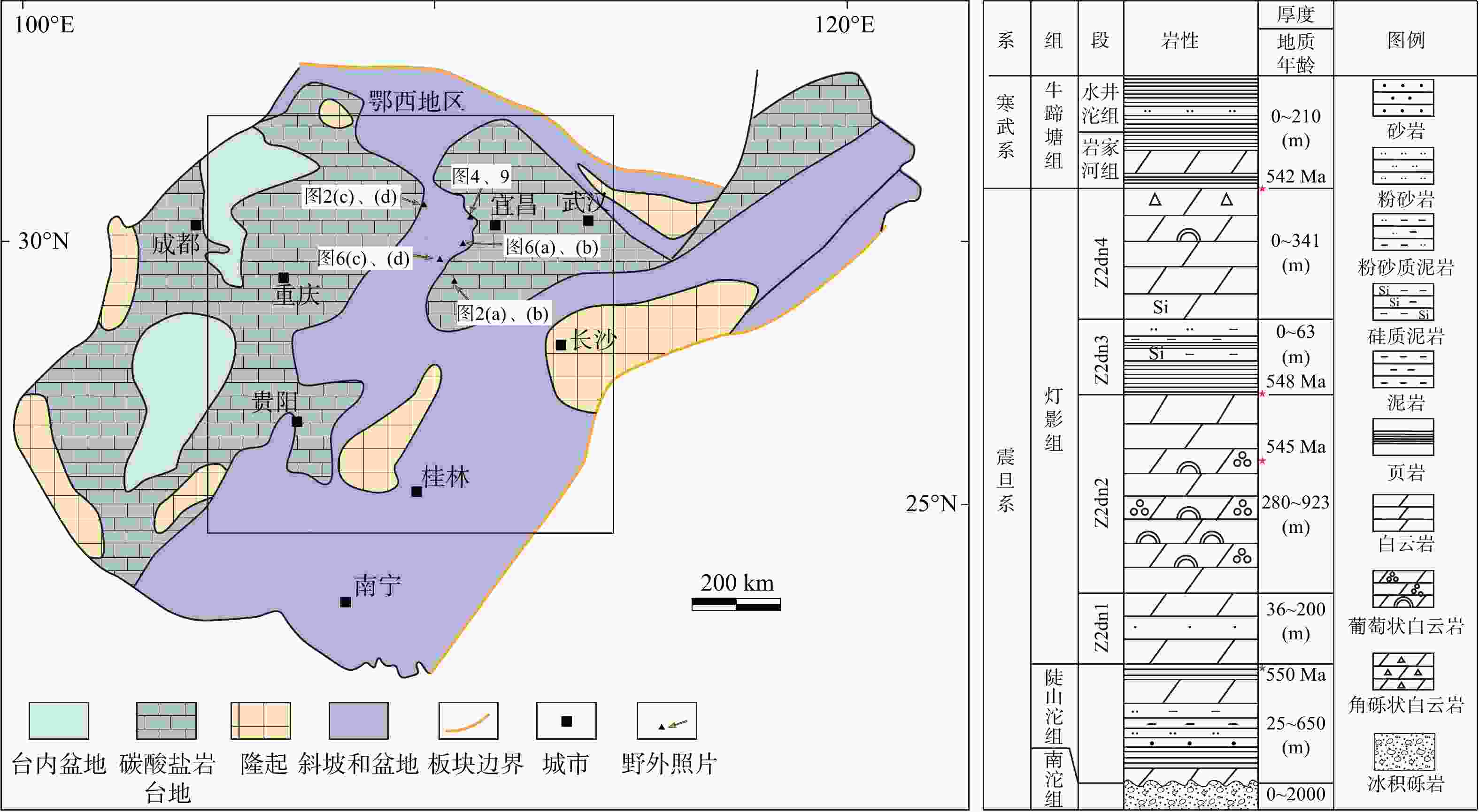 图 1 扬子地区震旦纪—早寒武世沉积古地理特征和鄂西地区地层综合特征(据王剑等,2024;丁一等,2025修改;地质年龄据Condon et al.,2005;Chen et al.,2015)