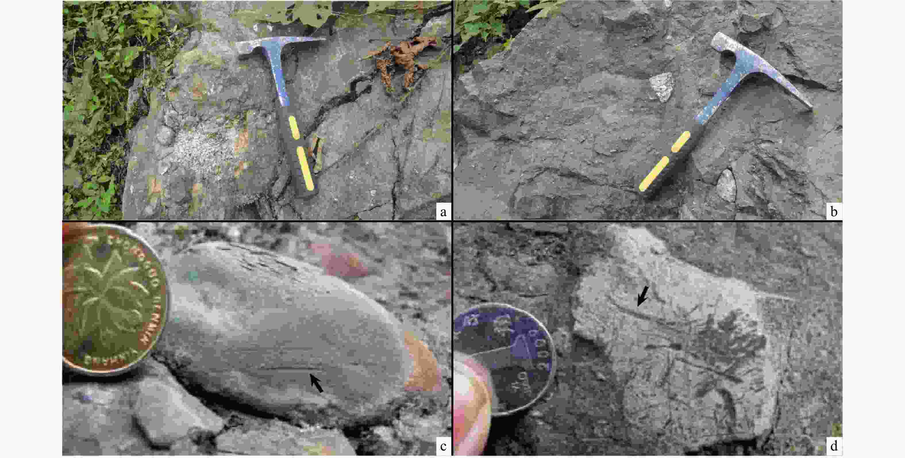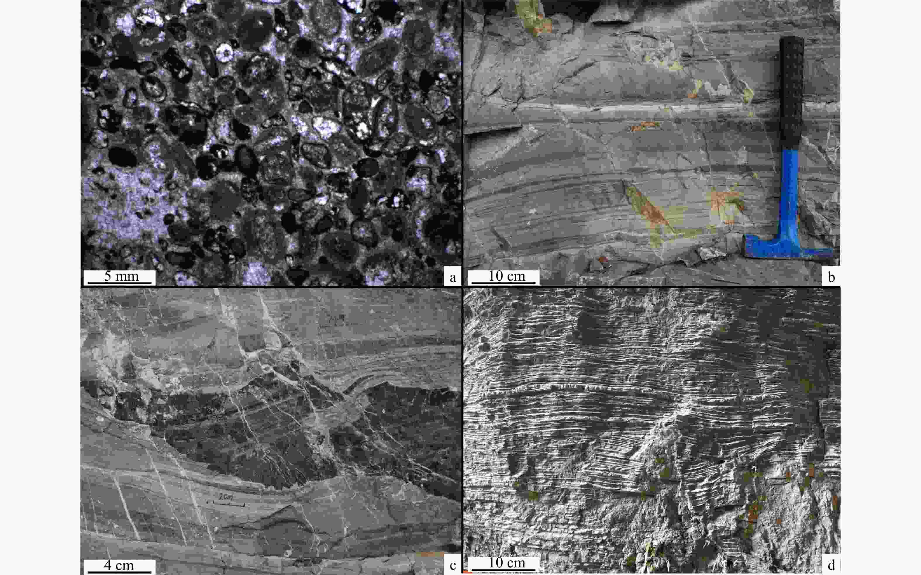 a—鹤峰白果坪剖面台地边缘浅滩鲕粒;b—鹤峰白果坪剖面水平层理;c—秭归九龙湾水平层理和滑塌构造;d—秭归头顶石丘状交错层理