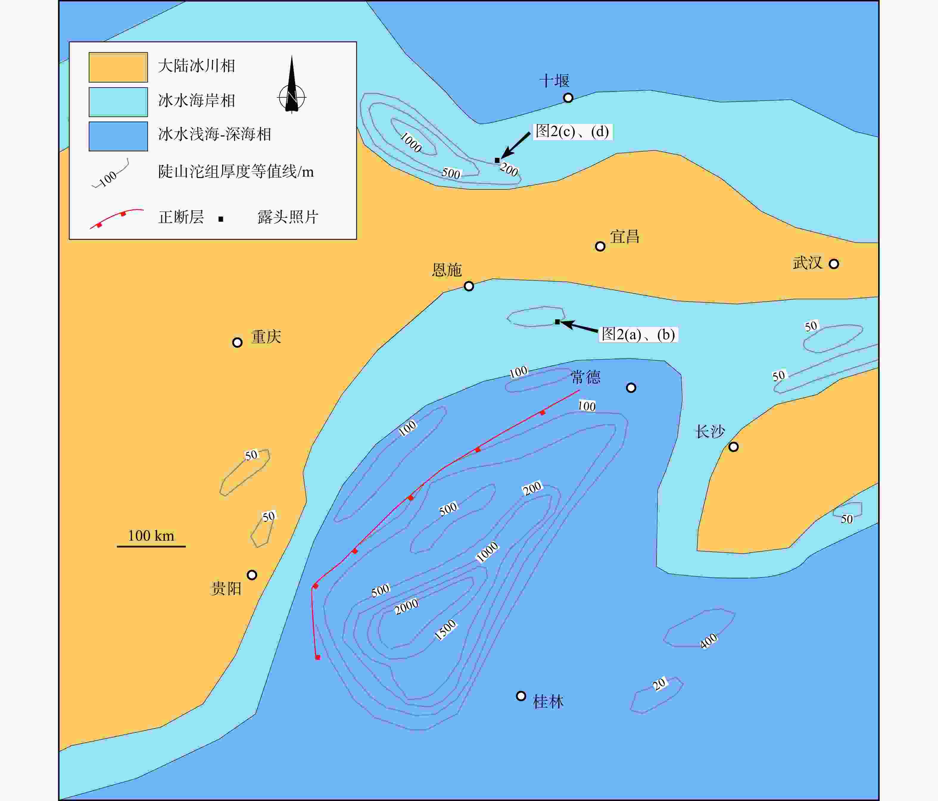 Figure 3. Isopach and sedimentary facies map of the Nantuo Formation in western Hubei (modified after Wang, 2000; location is shown in Fig. 1)