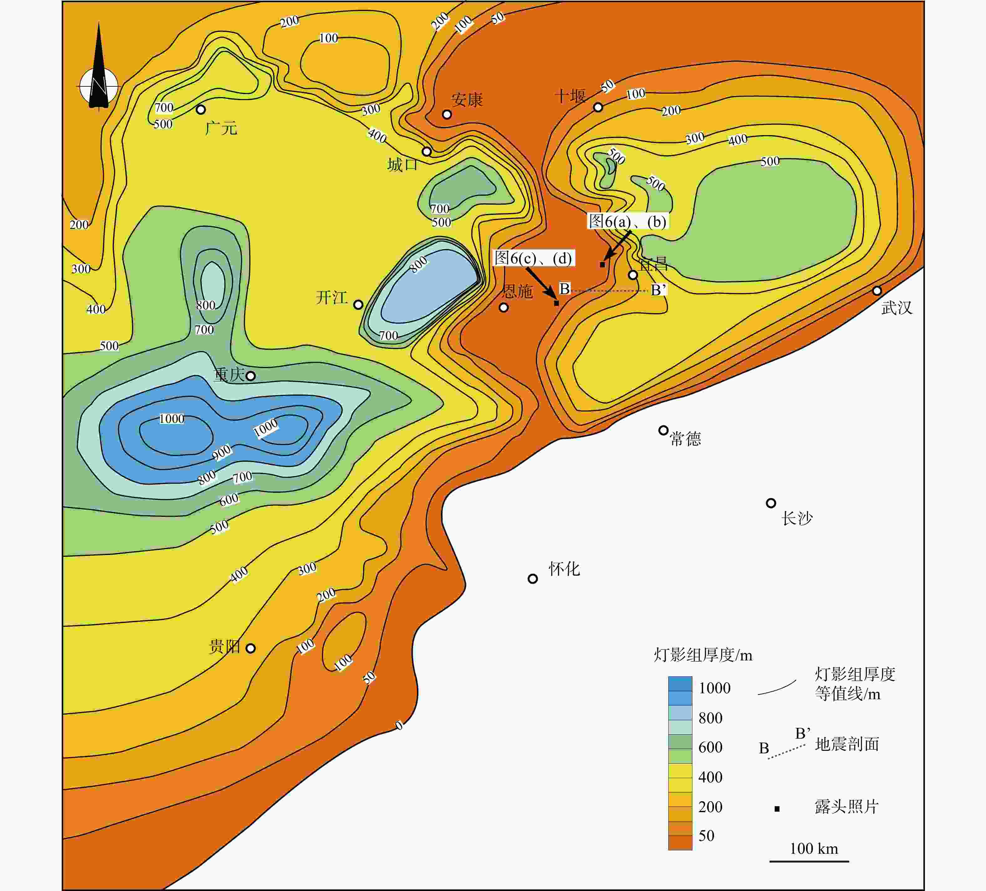 图 8 鄂西地区灯影组厚度等值线图(据汪泽成等,2014修改)