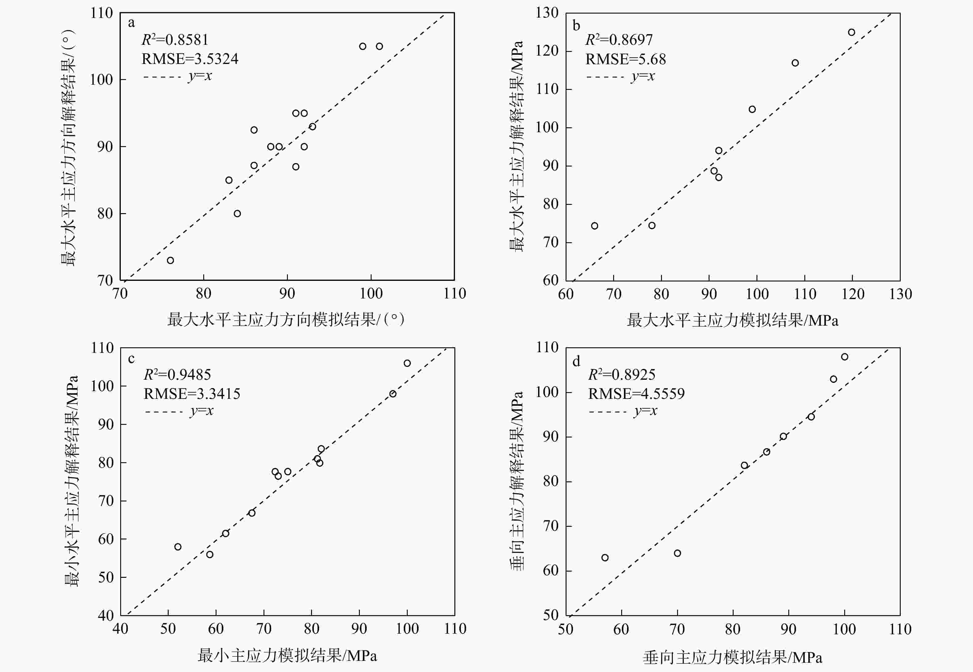 Figure 11. Cross-plot of simulation and interpretation results for current in-situ stress in the Dingshan–Dongxi area