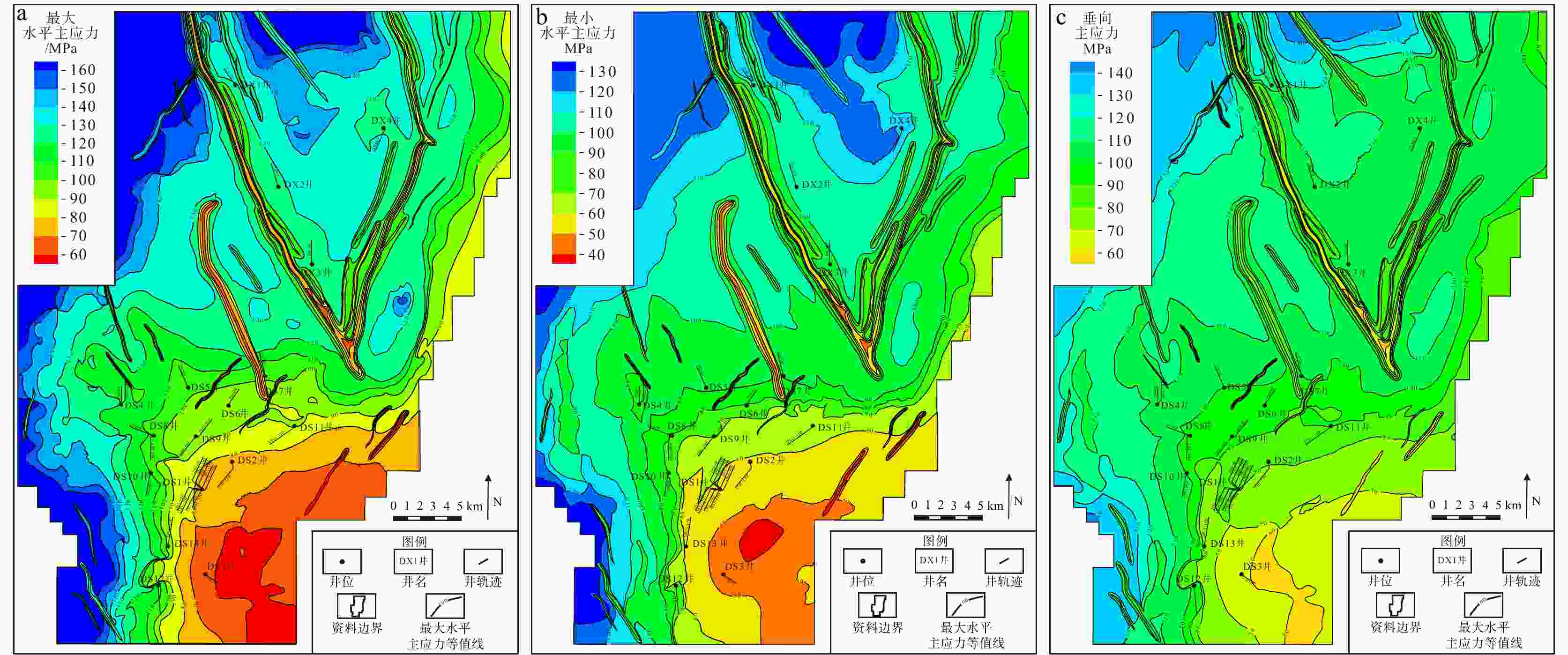 a—最大水平主应力方向;b—最大水平主应力大小;c—最小水平主应力大小;d—垂向主应力大小