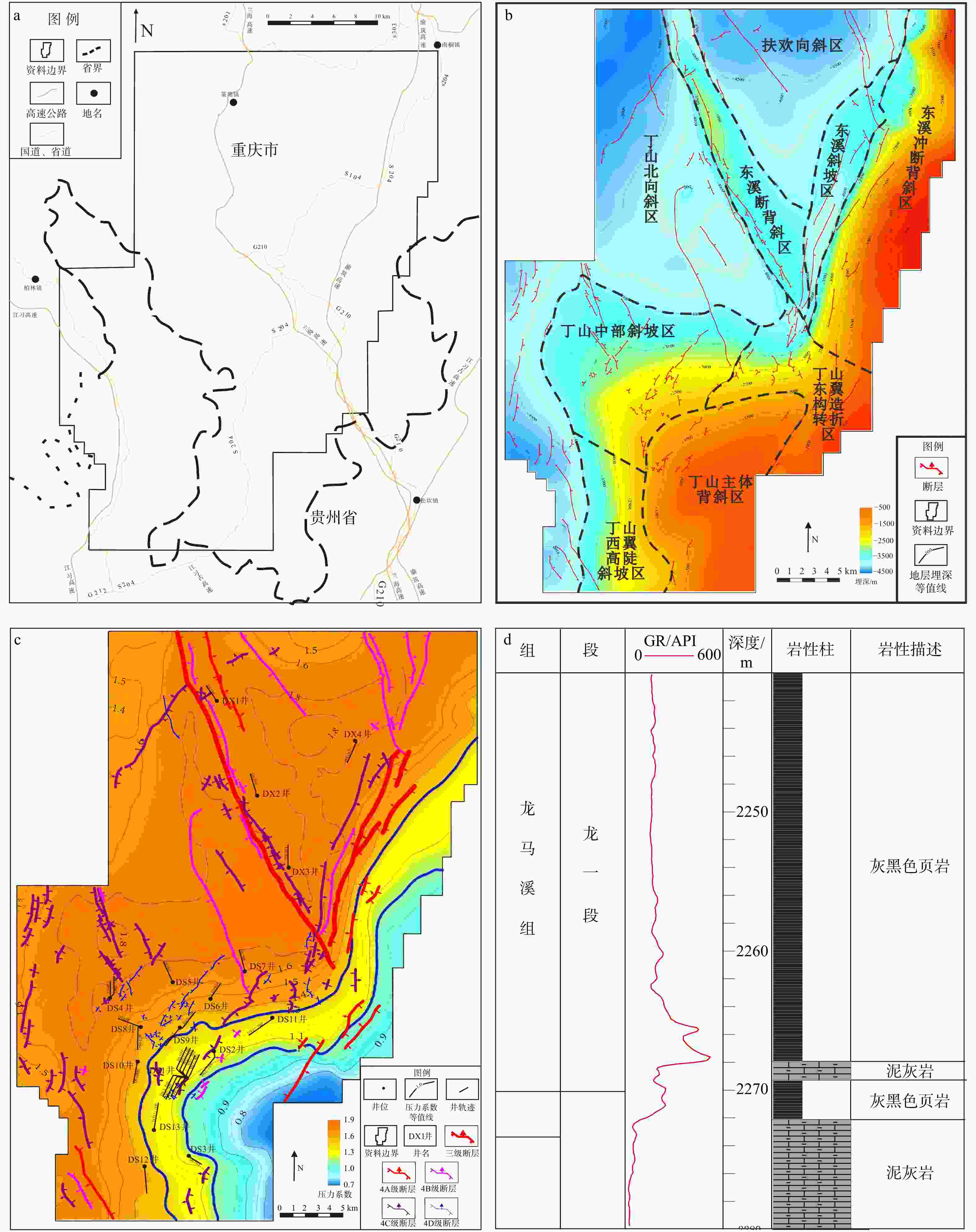 图 1 丁山−东溪地区构造位置、压力分布及地层综合特征图