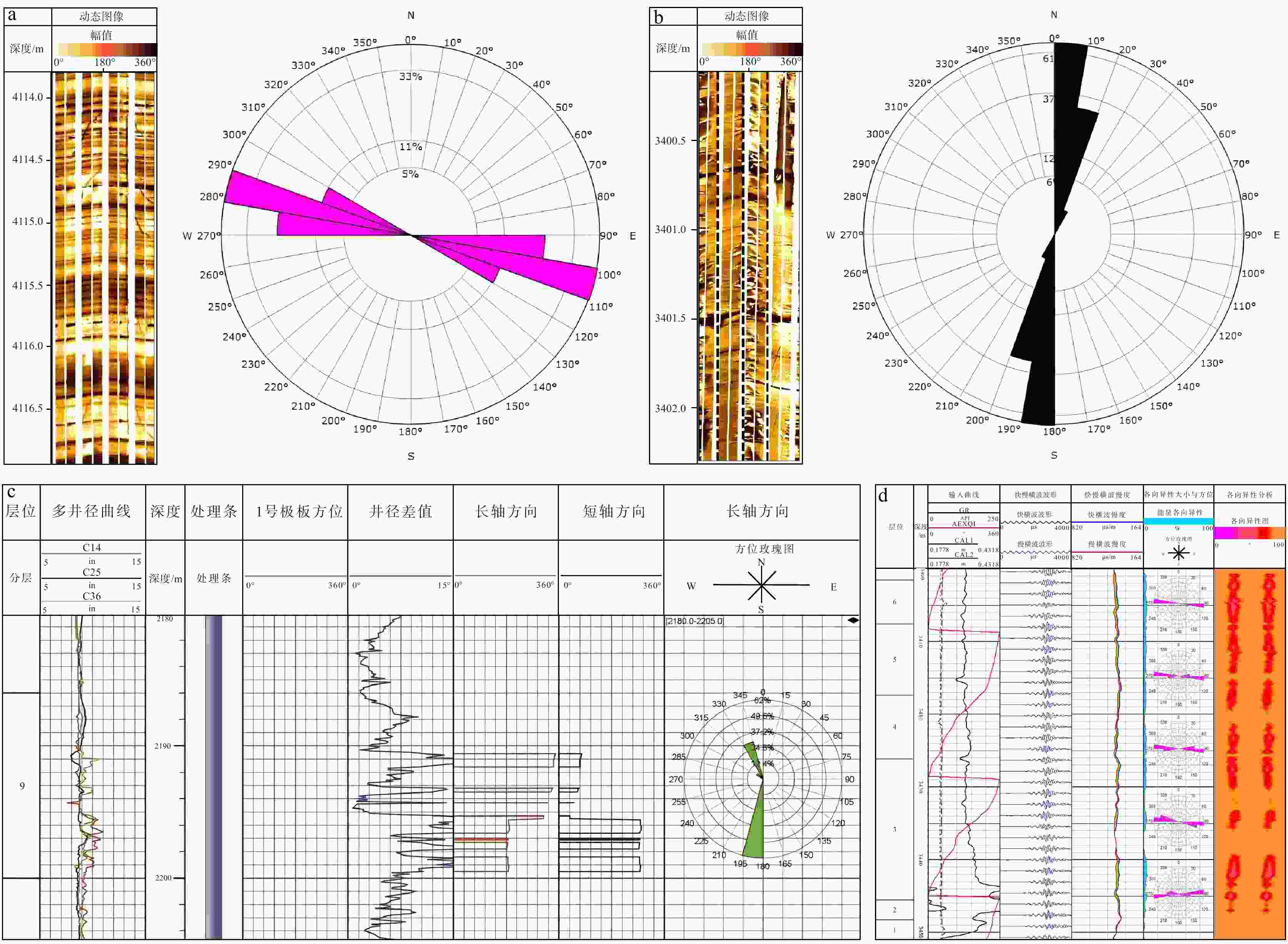 a—DS7井龙马溪组钻井诱导缝成像特征;b—DS9井龙马溪组井壁崩落成像特征;c—DS1井龙马溪组崩落椭圆拟合;d—DS9HF井龙马溪组阵列声波各向异性