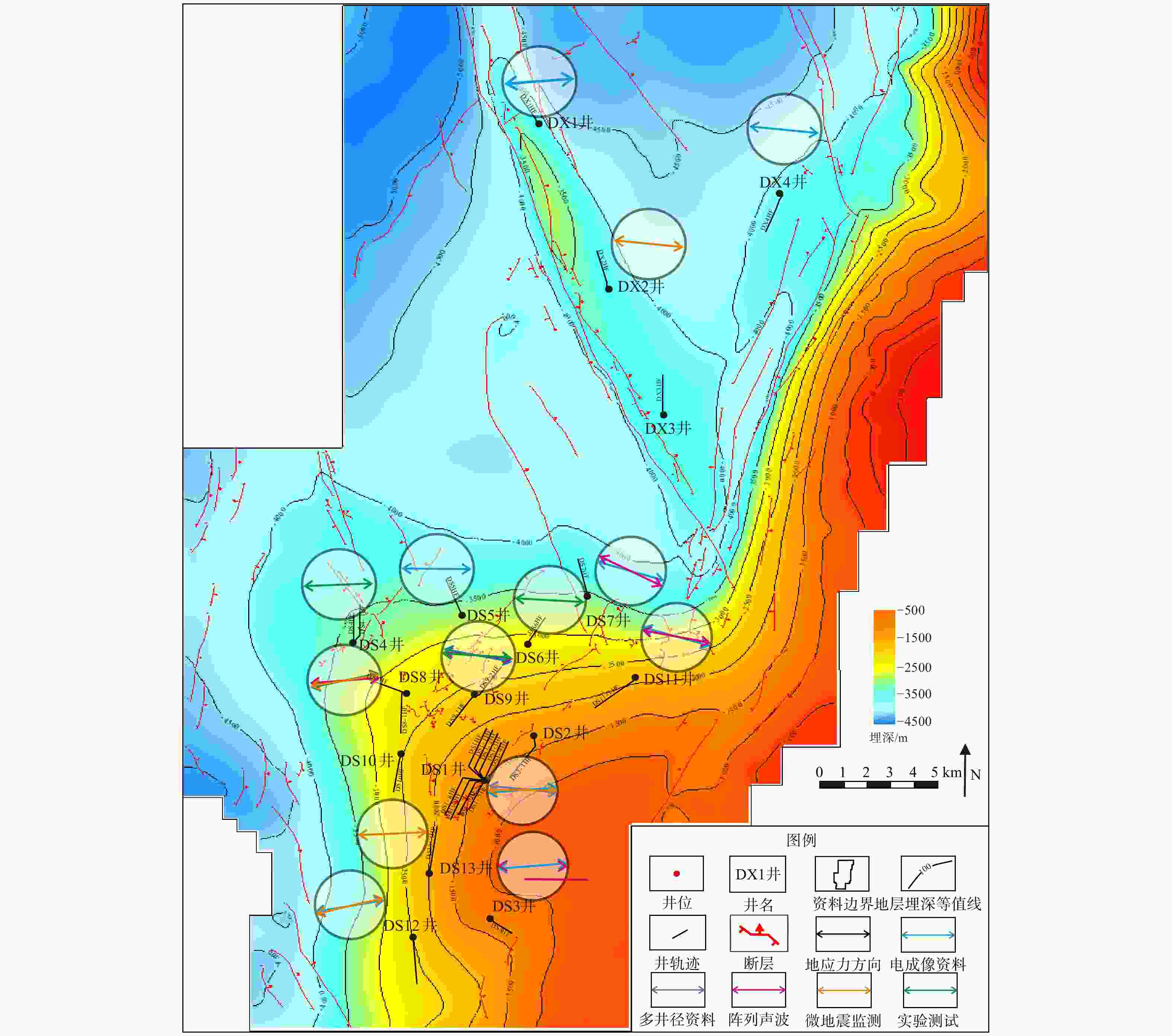 井名 垂深/m 瞬时停泵压力/MPa 最小主应力/MPa DS1-6HF 2335.70 43.79 63.64 DS1-2HF 2609.33 42.19 64.37 DS8-1HF 3777.00 50.64 82.74 DS6-1HF 3399.68 38.36 67.26 表 3 基于声发射实验的丁山−东溪地区龙马溪组龙一段现今地应力大小